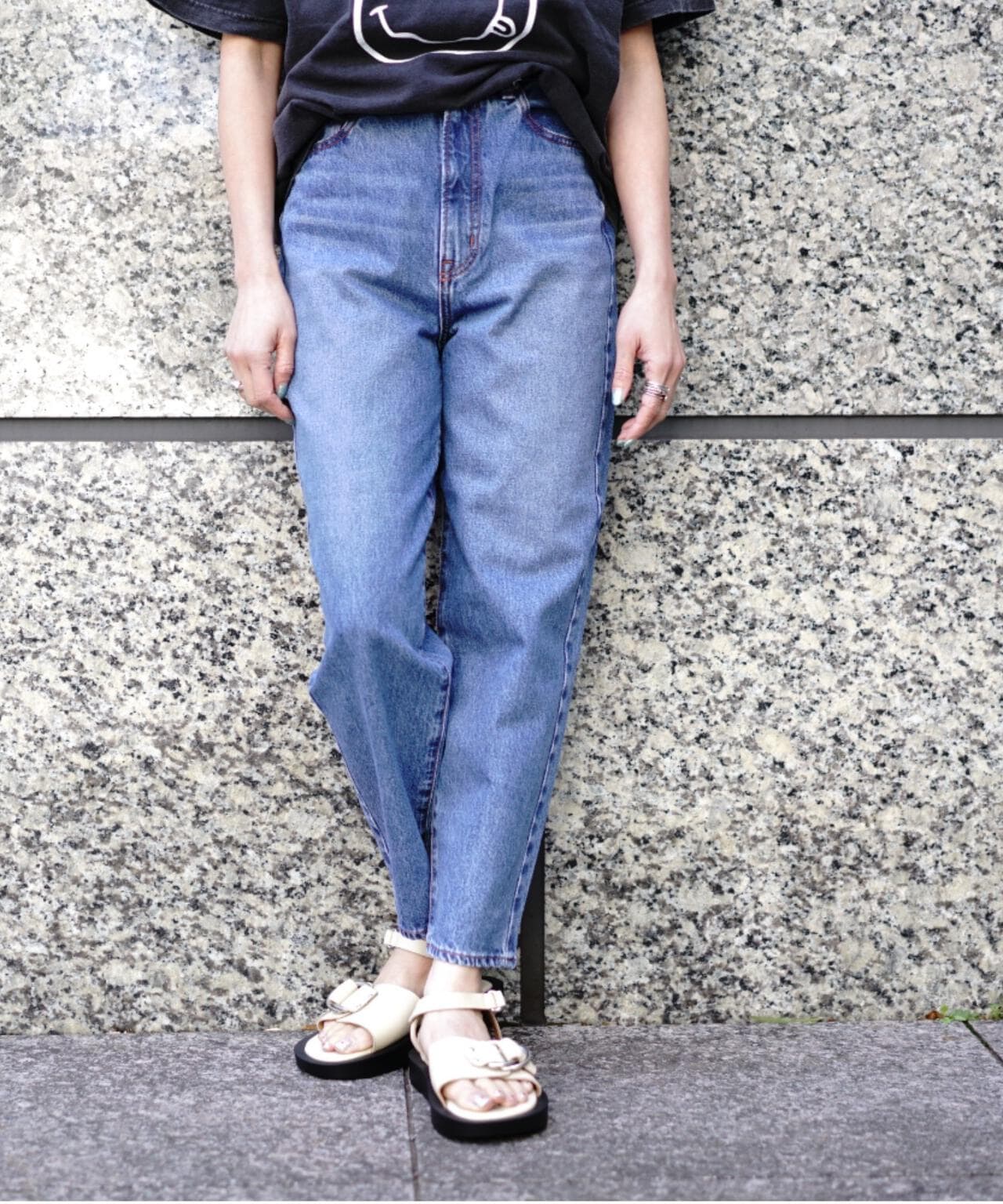 高いウエスト位置から裾にかけてテーパードされたバルーンレッグが特徴。どんな足元にも合わせやすい、あえて少し短めのレングス設定。NEEDBYオリジナルデニム地採用で、横糸にオープンエンド糸を使用。染色にはi-Nextという方法を採用し、サステイナブルなものづくりを意識し開発をしました。様々なコスト(加工コスト、エネルギー、製作コストなど)を抑えながらもNEEDBYらしい加工感が表現できるよう試作を重ね、メイドインジャパンならではのヴィンテージ感のある生地に仕上がりました。