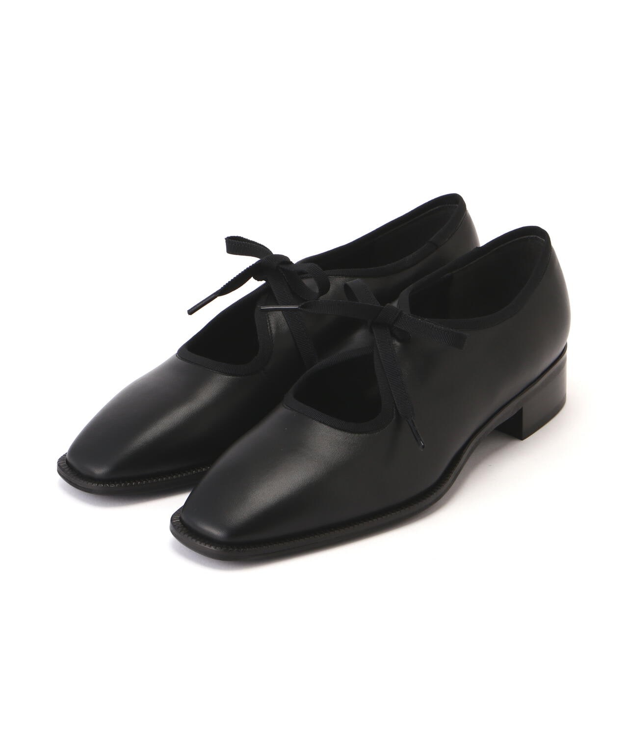 アデレードシューズ型に甲部分をくり抜いたアッパーのトップラインをぐるりとテープで囲み、リボンで留める変形メリージェーン。夏はパンプスのように涼しげなベアフィートで、冬はソックスと合わせてトラッドシューズとして楽しめるペア。