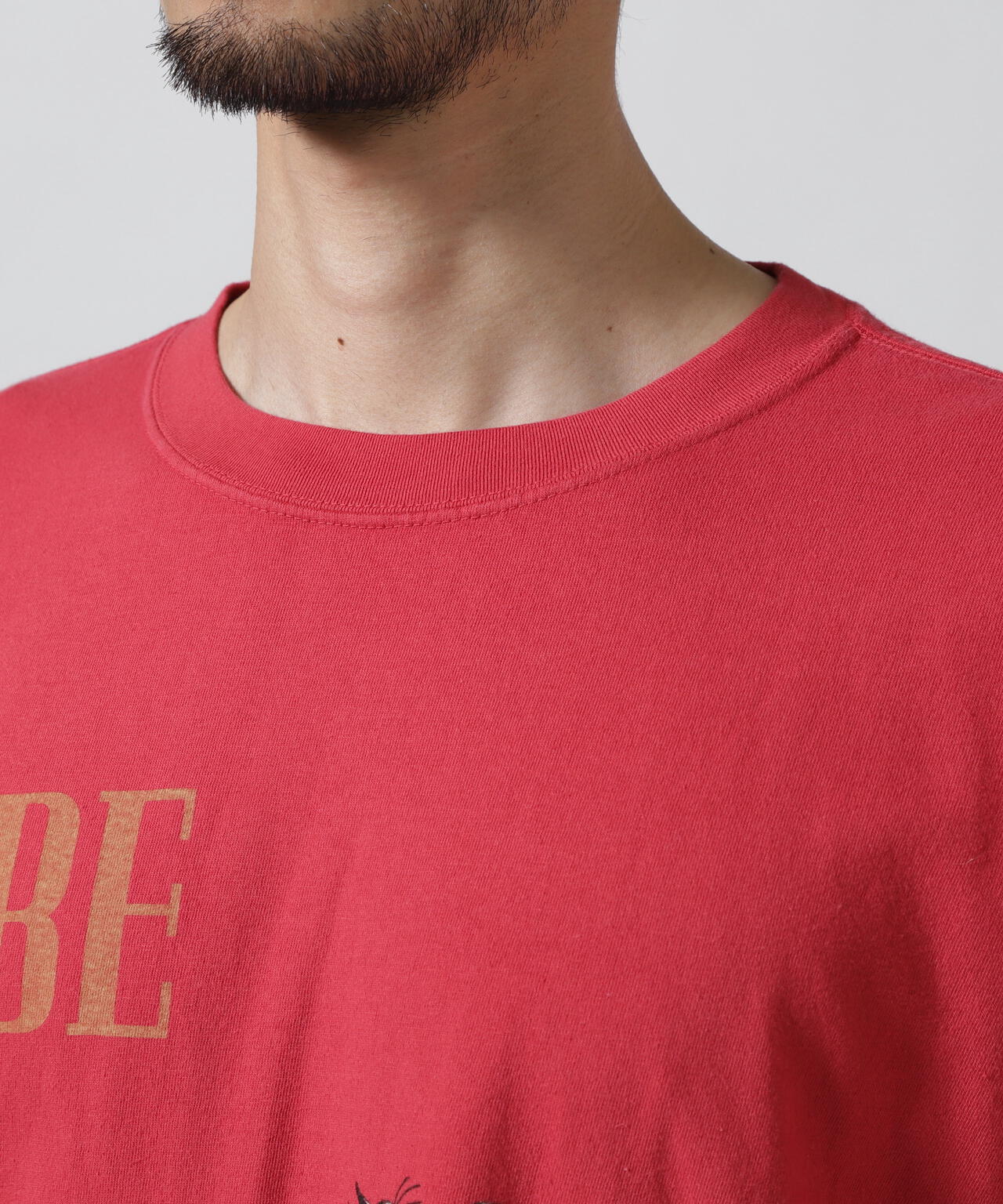 肌触りの良い20/-天竺生地(生地染め)に新作プリントを落とし込み、SP加工を施して着こむほどにヴィンテージの雰囲気が出るTシャツに作り込みました。