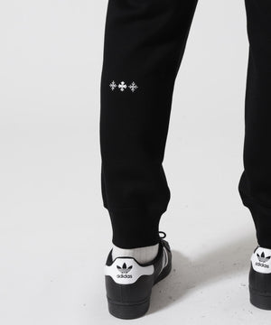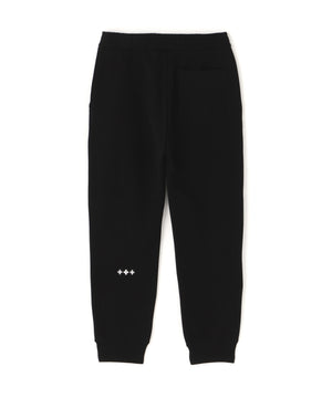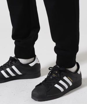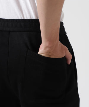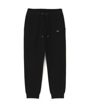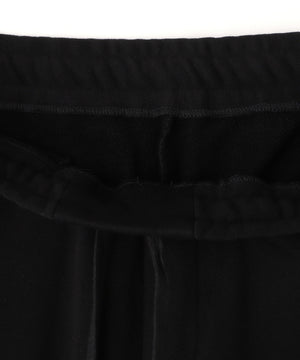 定番のスウェットパンツ。太すぎず細すぎずのちょうどよいサイズ感のリブパンツです。光沢とハリのある綿100%の裏毛素材を使用。ダブルシルケット加工で極限まで毛羽を減らしているため手触りも非常に滑らかです。ウエスト部分のアイレットの補強布をあえて表に出したデザインが特徴的。左前にロゴ、左後ろにクロスロゴをさりげなく配しています。