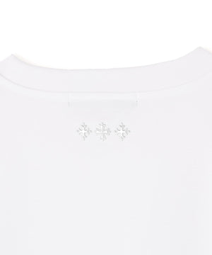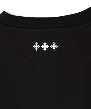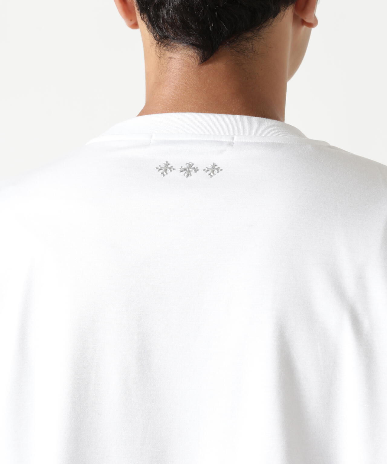 ややゆとりのあるサイズ感。胸のブランドロゴと袖口のクロスロゴがさりげなく高級感を添えています。