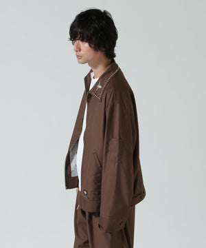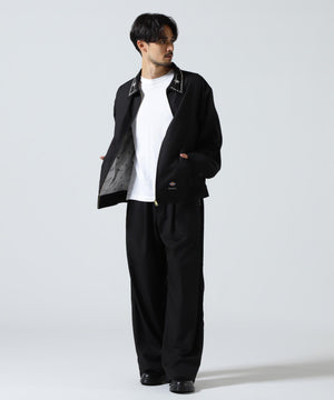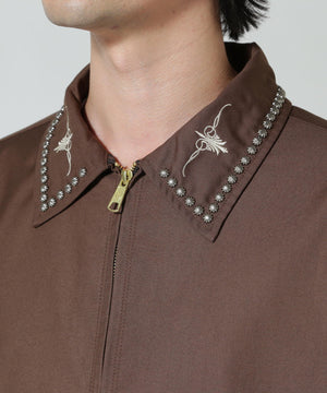 落ち感のある上質なポリエステル80%・レーヨン20%生地を使用し、軽やかな着心地と高級感を両立。シンプルなデザインながら、襟に施したオリジナルのピンストライプ刺繍とアポロコンチョが存在感を放ちます。