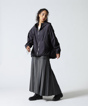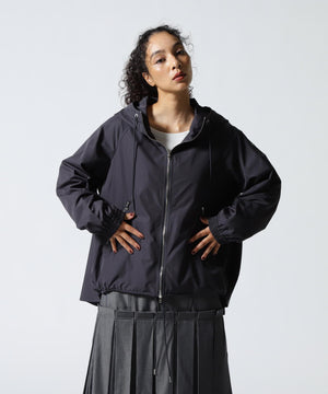 後ろ見頃にたっぷりと生地を使用して、美しいドレープを表現したフードブルゾン。