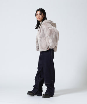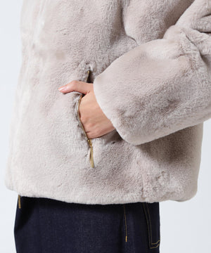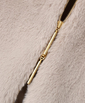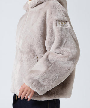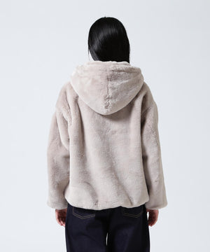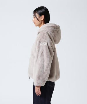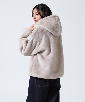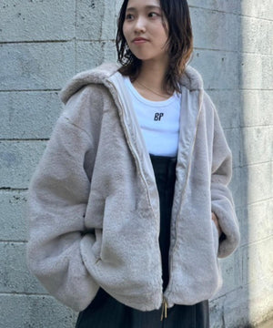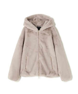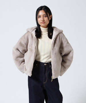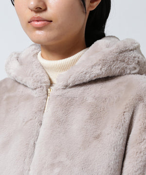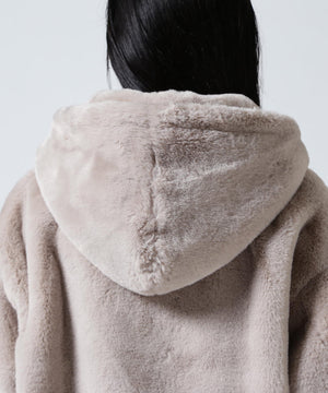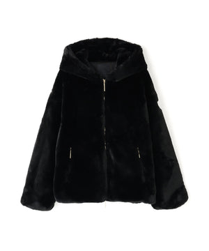 艶やかなエコファー素材のフード付きブルゾン。