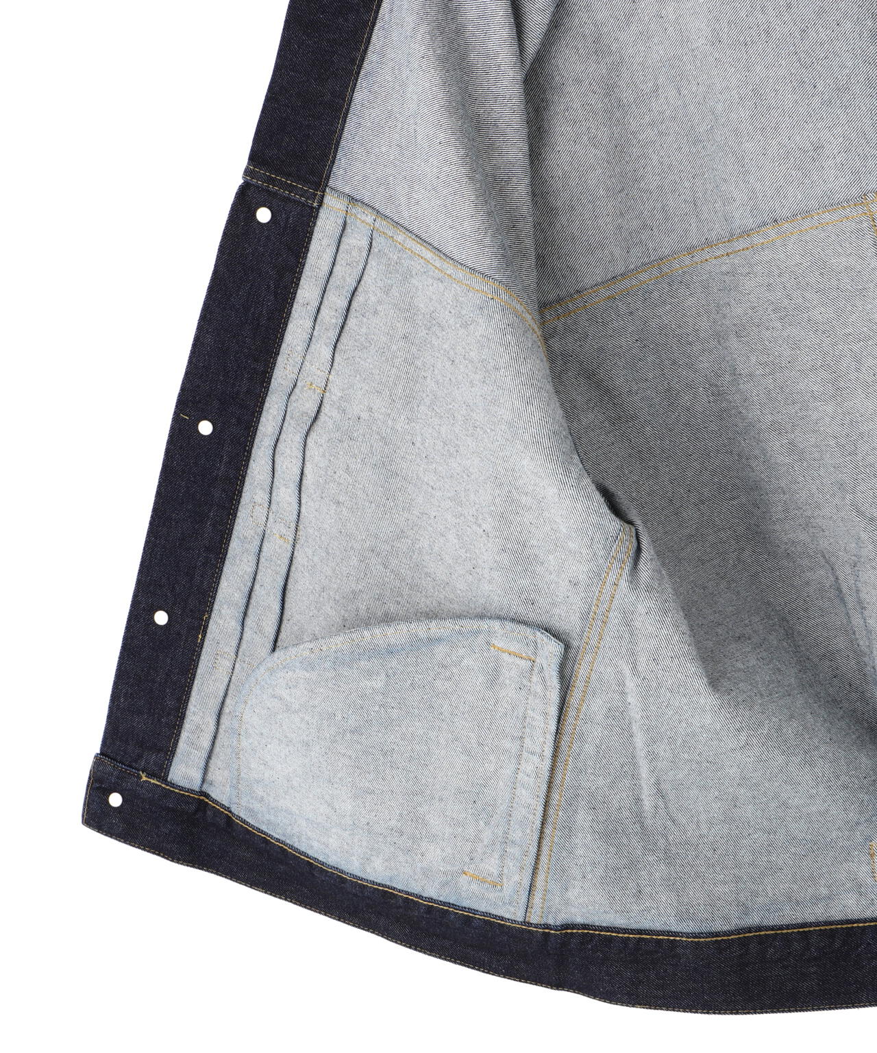 他社の素材との最大の違いは戻る(キックバックする)力です。一般的に伸びるだけの素材なら他にもあるのですが、ここまで元通りに戻る力を持ったデニムはISKOの特許でしか実現出来ません。この素材をBIGJOHNが特注してリアルユーズドが表現できる素材として別注しています。
