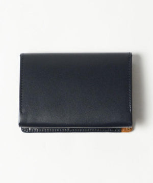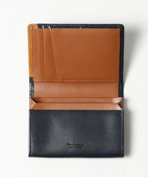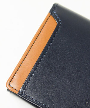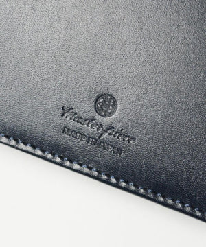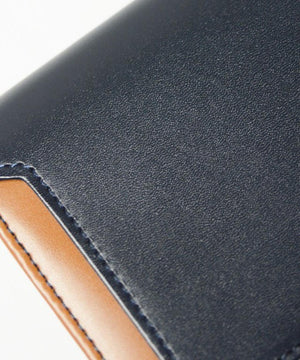 本体素材は日本で唯一*LWG(レザーワーキンググループ)を取得しているタンナーで作られており、ステアレザーにクロム鞣しをして染色をし、銀面を擦って浮きが出ないように特殊な薬品を使いタイトコート加工をしています。バインダーで銀面を平らに滑らかにならしていき、塗料を吹き付けることにより綺麗な発色のレザーになります。表面にはキップ調の型押しをすることで肌目の整った仕上がりとなっています。内装で使用している付属レザーには、肌目と堅牢度のバランスのとれたキップレザーを使用しています。繊維の密度が高く、しなやかで味があり、革小物を作るのに最適と言われています。表面は樹脂を使用して傷つきにくく、深い艶のあるレザーとなっています。全型共通で前面にICカードが入れられる仕様になっています。※LWG(レザーワーキンググループ)とはなめし工場を監査 する国際団体。環境コンプライアンスの遵守や能力を評価しランク付けするとともに、革のトレーサビリティを追求している。