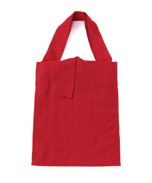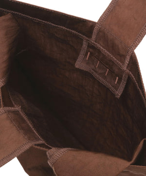 裏返したようなデザインが特徴的なワンショルダートートバッグ。S、M、Lの3サイズ展開のMサイズです。ウェアを製造する縫製工場にバッグの仕様を依頼することで、バッグメーカーにも服メーカーにも無い、類を見ない空気感漂うアイテムに仕上げています。