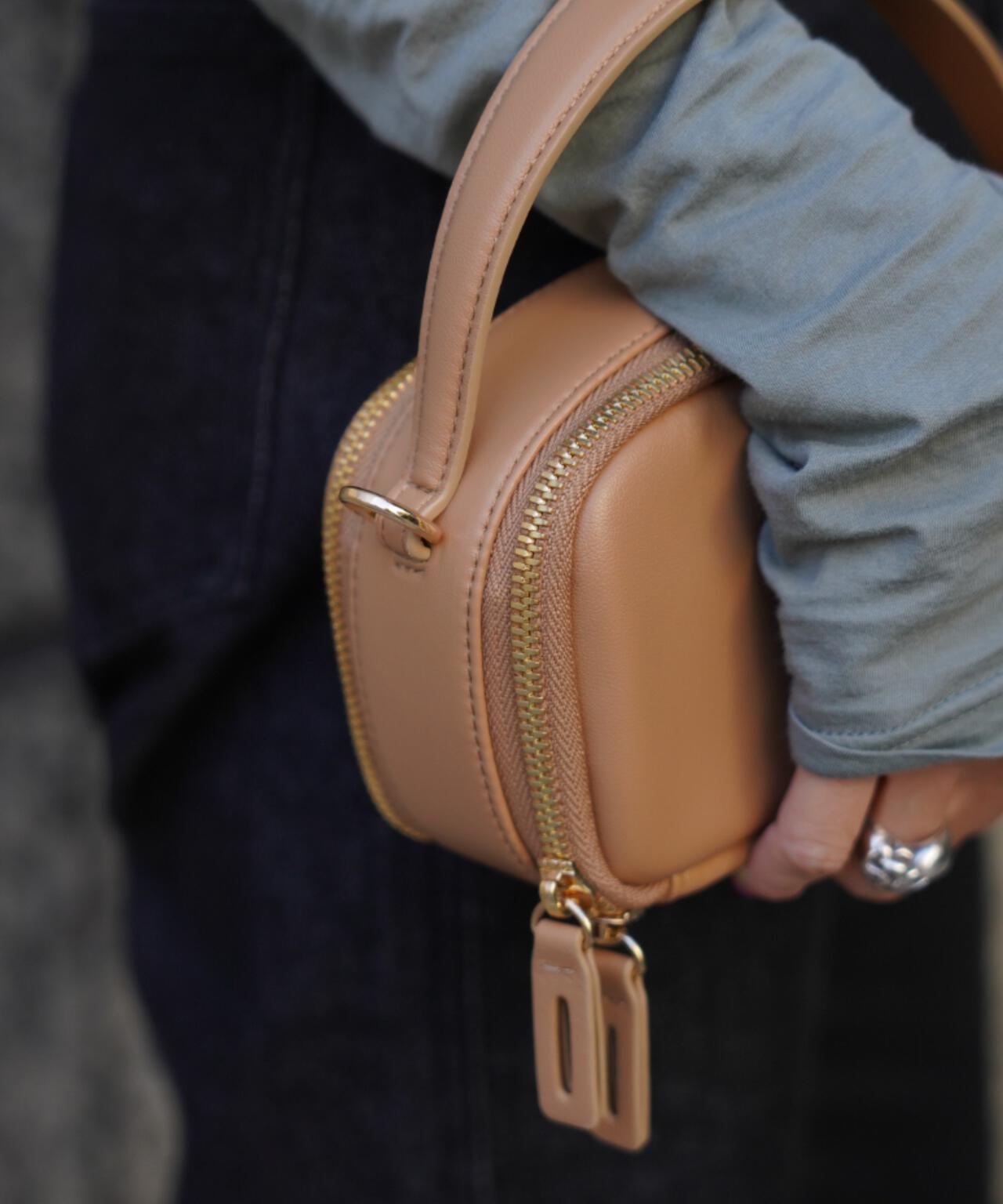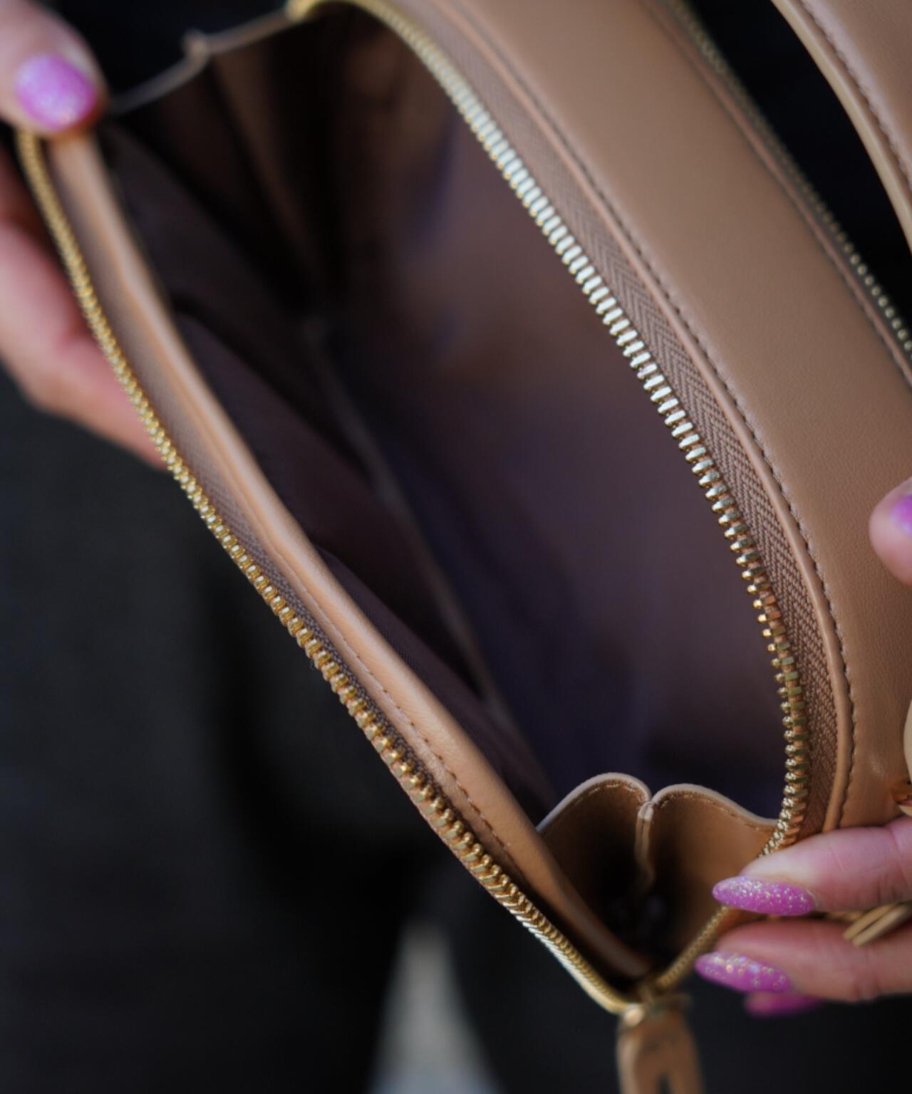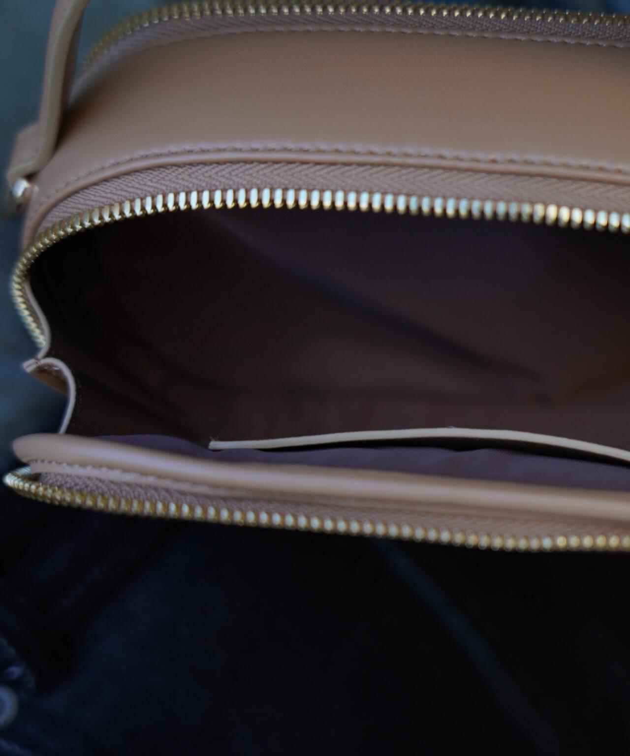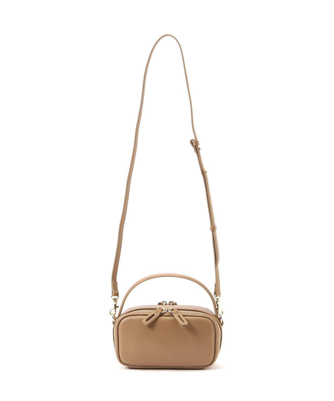 ショルダーストラップ付きでハンドバッグと斜め掛けも可能な2WAY仕様。2部屋構造で荷物の整理に便利です。