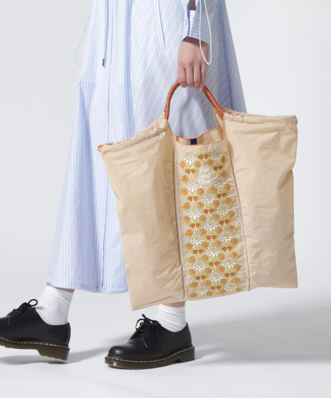 Ball and Chainは大切に使い続けたいと思える優れた デザインのショッピングバッグです。 耐久性、撥水性に優れた厚手のポリエステル素材に、 グラフィックデザインをそのまま「刺繍」で施すことで、 高級感がありデザイン性の高いバッグとなっています。 丸く折りたたみ付属のゴムバンドでとめると手のひらほどの コンパクトサイズになるため、持ち運びにも便利です。 普段のお買い物はもちろん、エコなプレゼントとしてもおススメです。