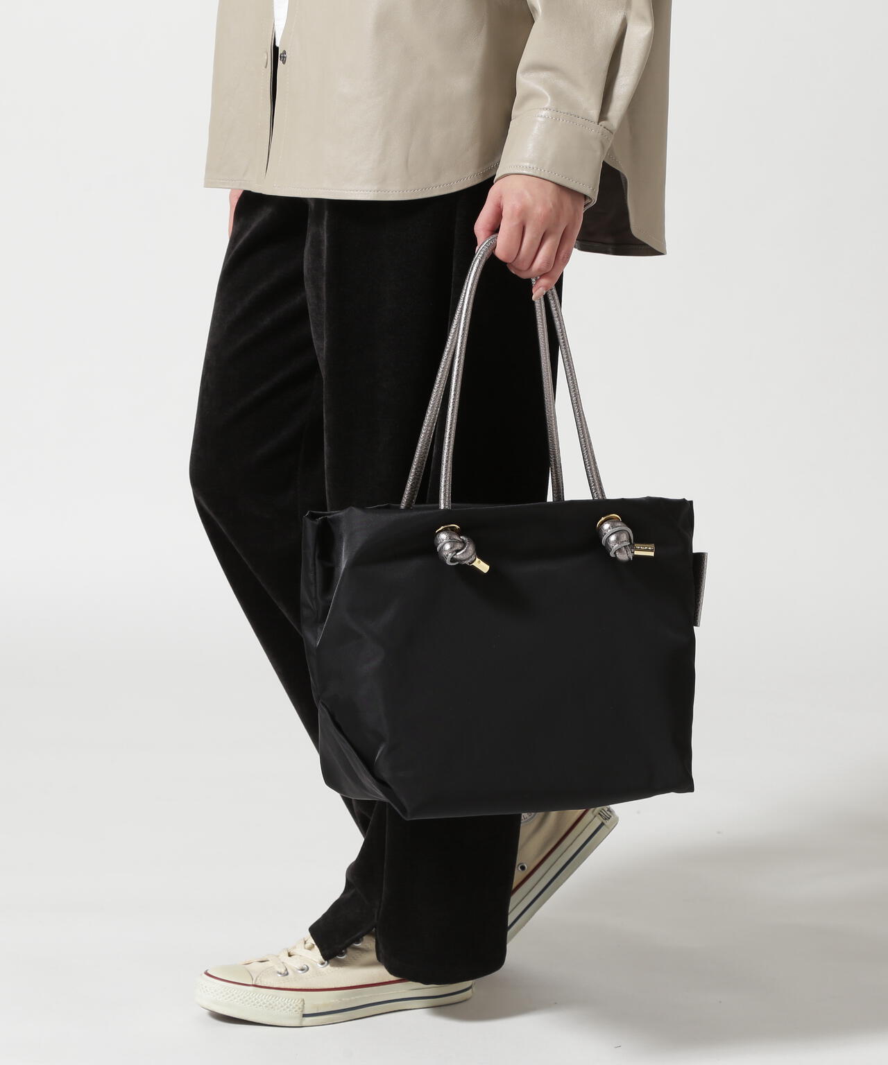 シンプルなデザインのボディにメタリックレザーのノットハンドルがアクセントになったトートバッグのMサイズ。