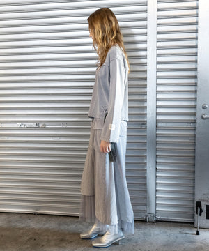 左裾のハトメと配色のテープが、コーデを引き締めるアクセントに。
