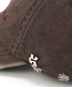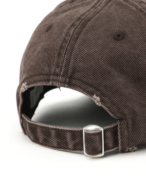 計算されたダメージ加工が、ラフさの中に深みを生む。深めのフォルムとカーブの効いたつばが顔まわりをすっきりと見せ、小顔効果も約束。