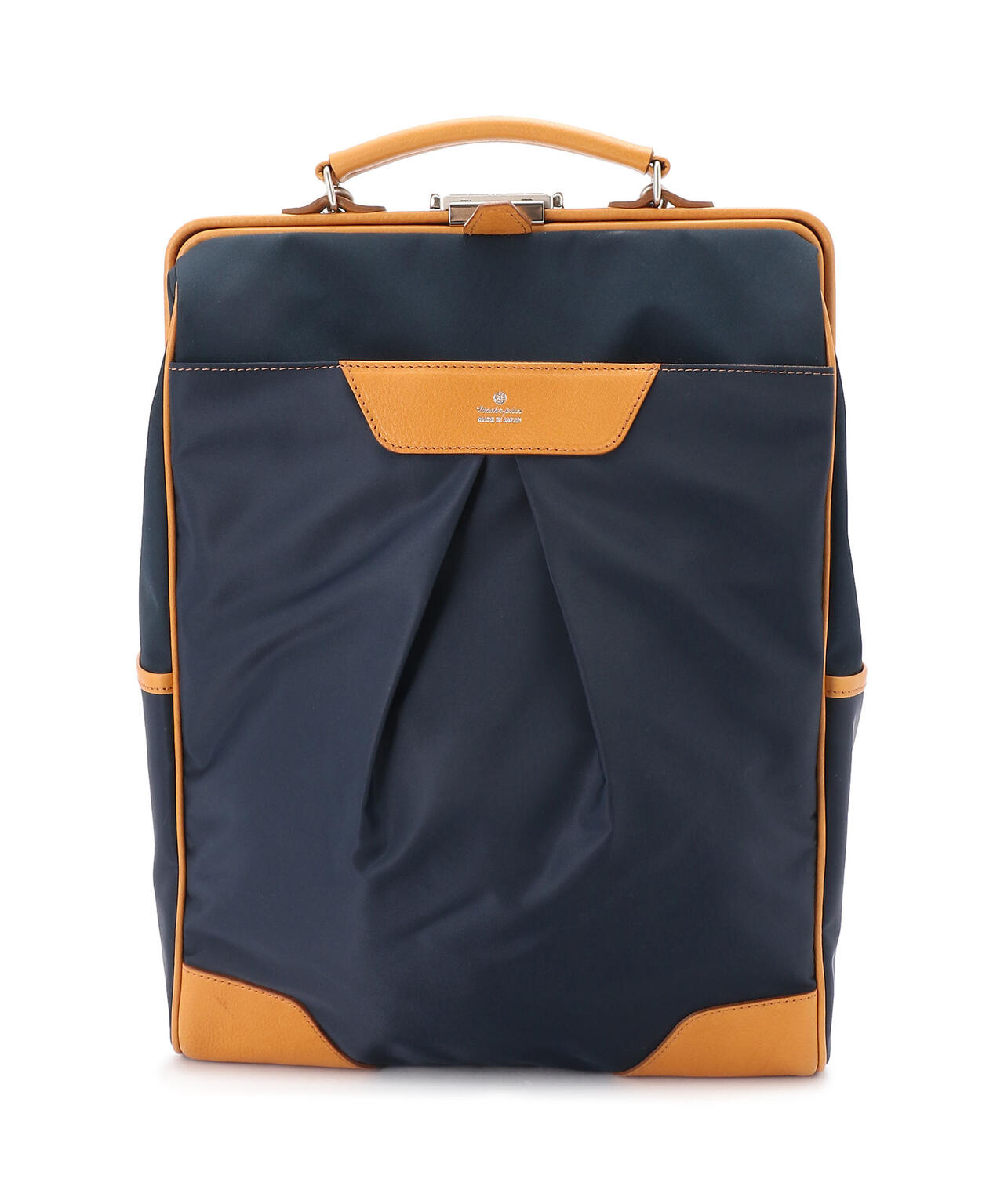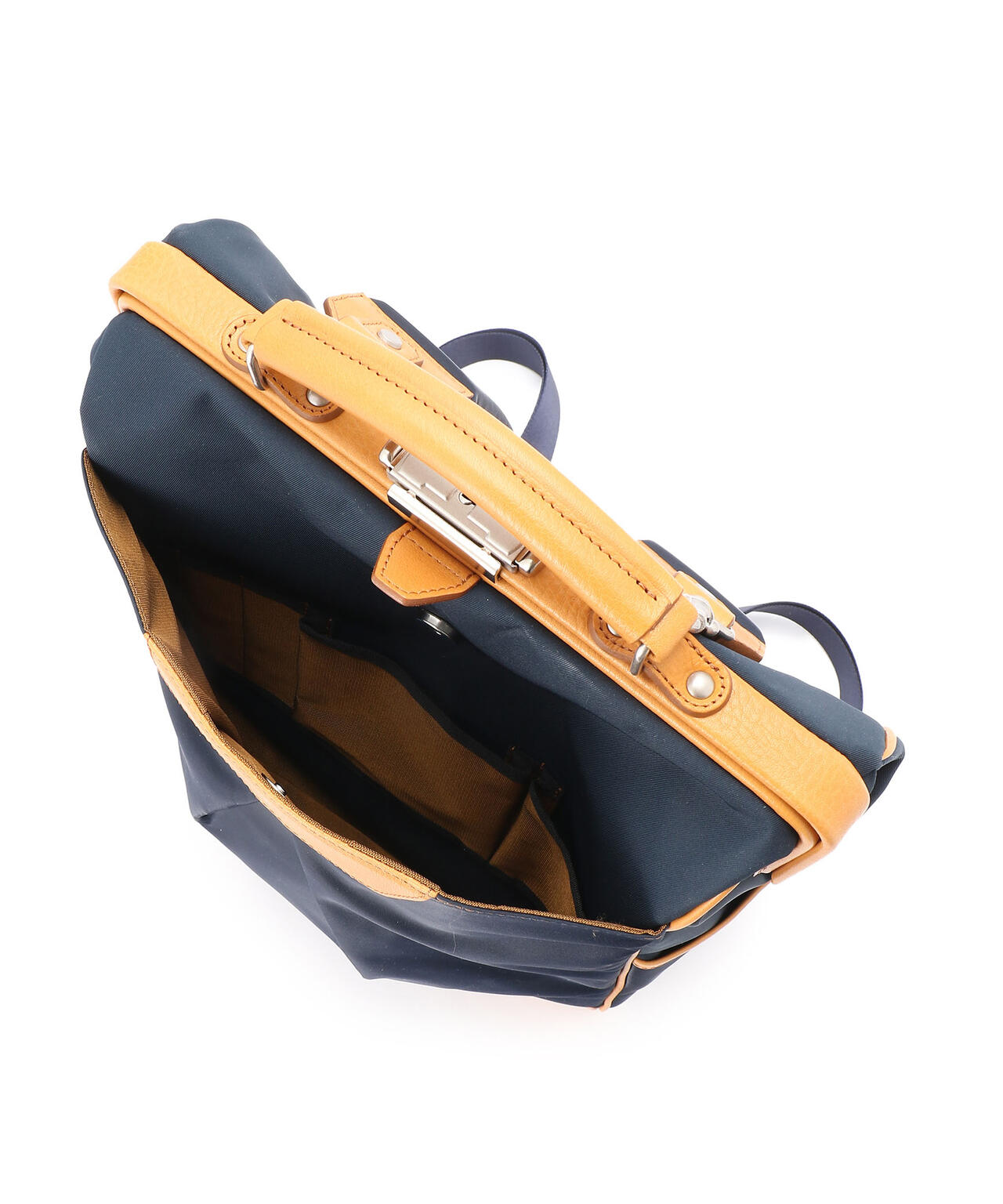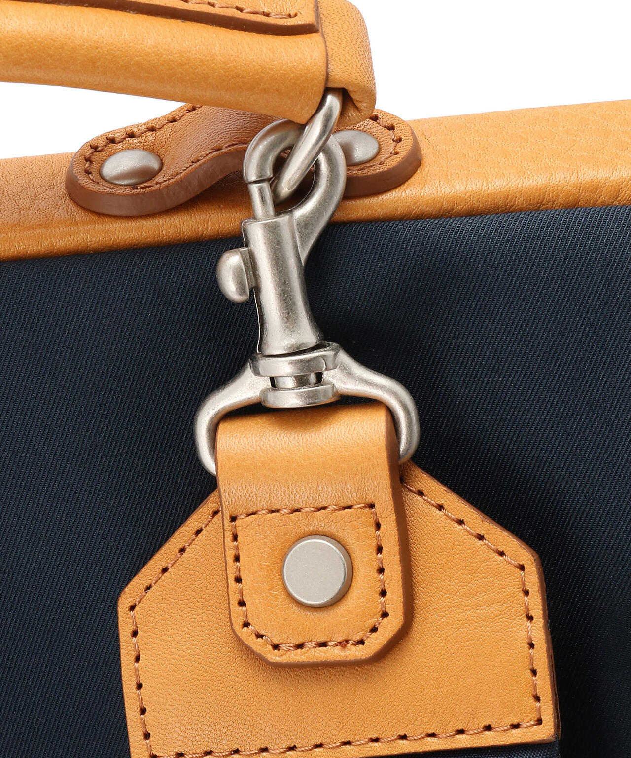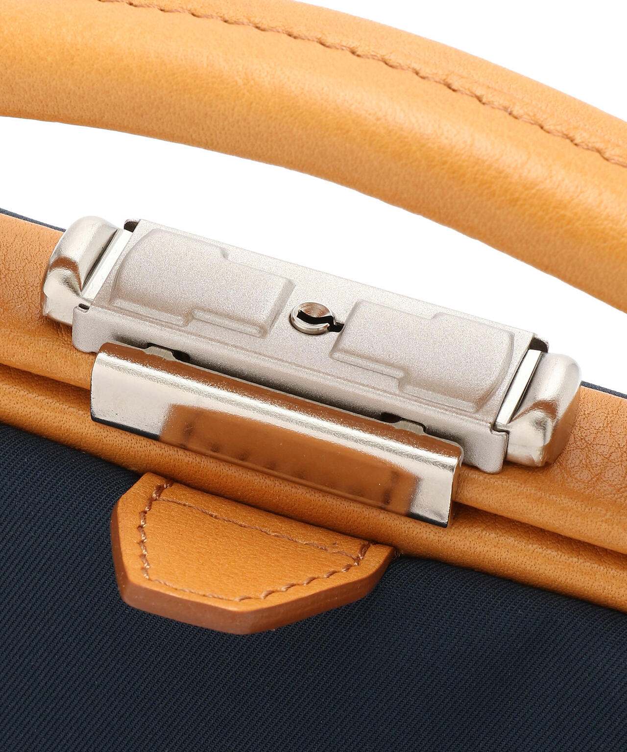本体素材は細めの 150d のホ?リエステル強撚糸をタテ、ヨコに使い高密度て?織り込むことて?軽量て?ありなか?ら高強度かつ、光沢を抑えた上品なツイルて?す。 表面にはテフロンTM加工を施し、撥水性と防汚性を持たせています。さらに防水性と強度を高めるために裏面にも PVC 加工を施しています。 付属の生地は高密度て?織ったナイロンツイルて?、タテ糸に 110d のセミタ?ル糸を、ヨコ糸に 210d のフ?ライト糸を使用し、2 種類の光沢を持たせることて?出る深みのある色か?特徴て?す。付属の レサ?ーにはコンヒ?ネーションて?鞣されたカウレサ?ーをヘ?ースにオイル加工を施したあと染料て?仕上け?ることにより、しなやかさと色の深みを出し、その後ミリ ンク?加工 ( 革を揉み込んて?シホ?とツ ヤを出す ) を施すことにより独特の風合いに仕上か?ったレサ?ーを使用しております。錠前は付属の鍵て?施錠か?可能て?す。クラシックな雰囲気のタ?レスハ?ック?を、軽量な化繊素材を用い、現代にあった機能性を持たせたオンオフ兼用、ユニセックスて?使えるシリース?て?す。