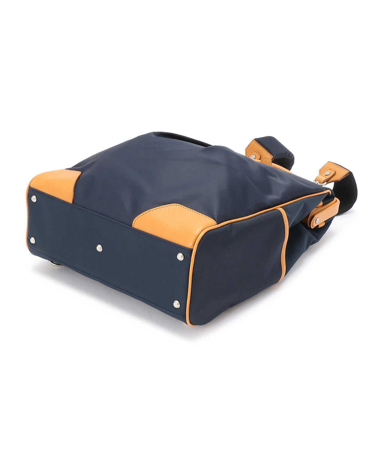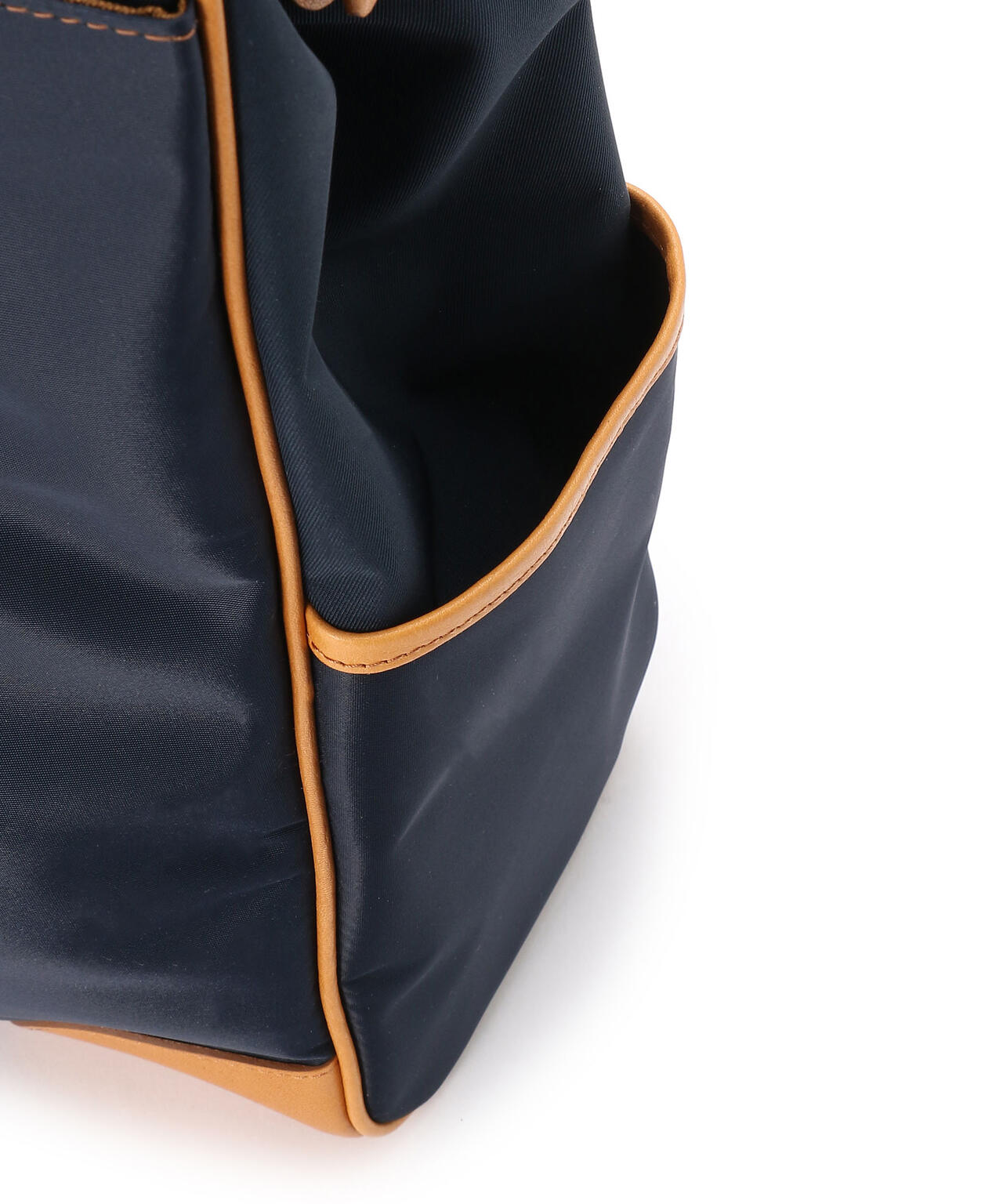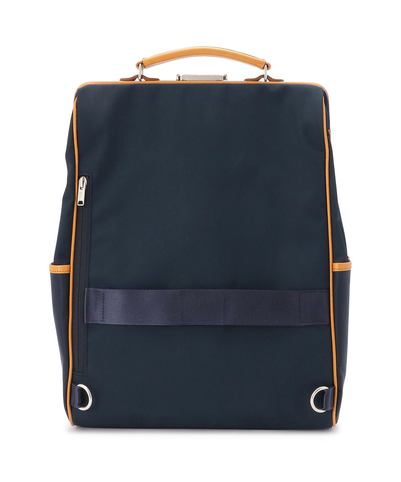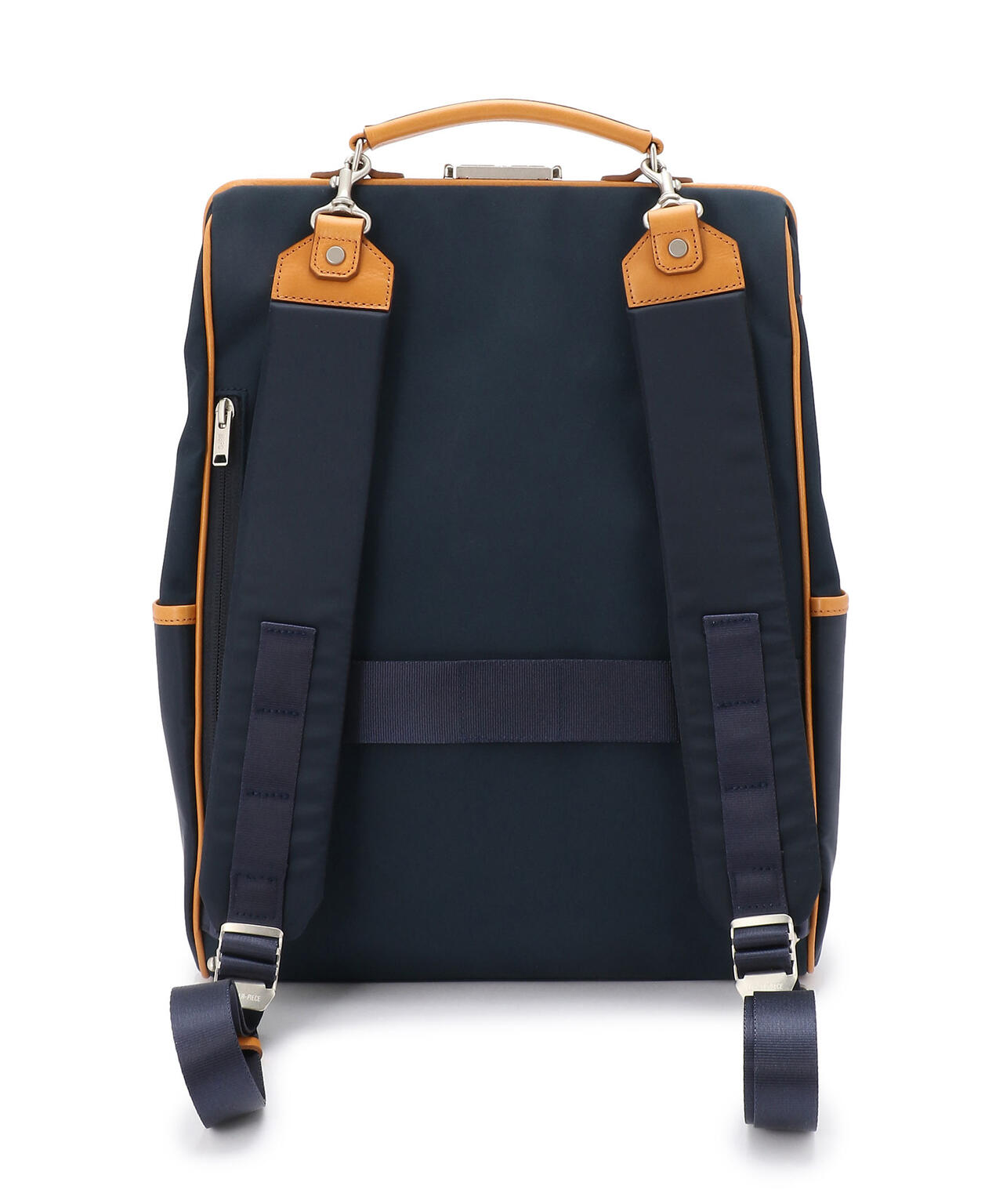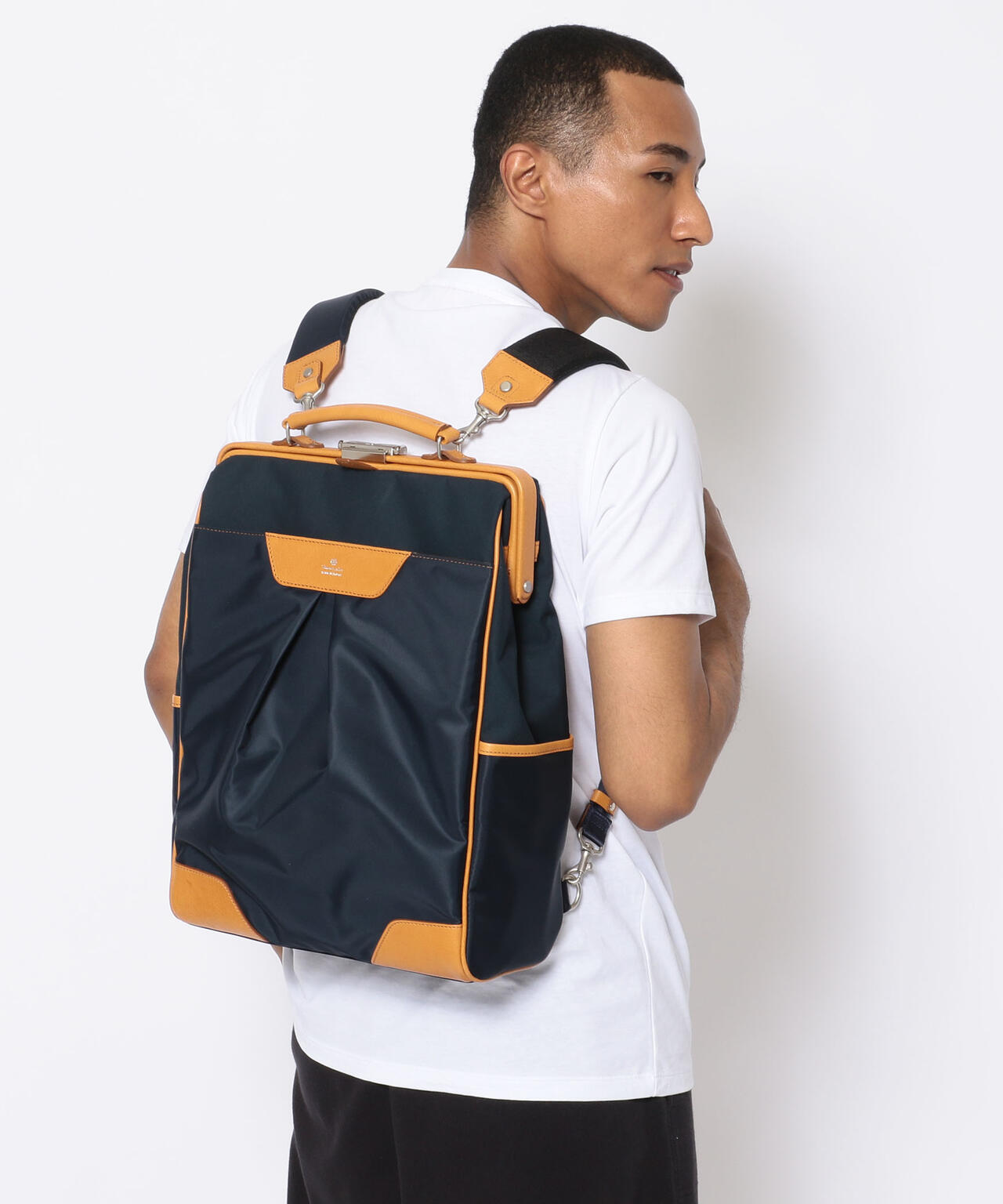本体素材は細めの 150d のホ?リエステル強撚糸をタテ、ヨコに使い高密度て?織り込むことて?軽量て?ありなか?ら高強度かつ、光沢を抑えた上品なツイルて?す。 表面にはテフロンTM加工を施し、撥水性と防汚性を持たせています。さらに防水性と強度を高めるために裏面にも PVC 加工を施しています。 付属の生地は高密度て?織ったナイロンツイルて?、タテ糸に 110d のセミタ?ル糸を、ヨコ糸に 210d のフ?ライト糸を使用し、2 種類の光沢を持たせることて?出る深みのある色か?特徴て?す。付属の レサ?ーにはコンヒ?ネーションて?鞣されたカウレサ?ーをヘ?ースにオイル加工を施したあと染料て?仕上け?ることにより、しなやかさと色の深みを出し、その後ミリ ンク?加工 ( 革を揉み込んて?シホ?とツ ヤを出す ) を施すことにより独特の風合いに仕上か?ったレサ?ーを使用しております。錠前は付属の鍵て?施錠か?可能て?す。クラシックな雰囲気のタ?レスハ?ック?を、軽量な化繊素材を用い、現代にあった機能性を持たせたオンオフ兼用、ユニセックスて?使えるシリース?て?す。