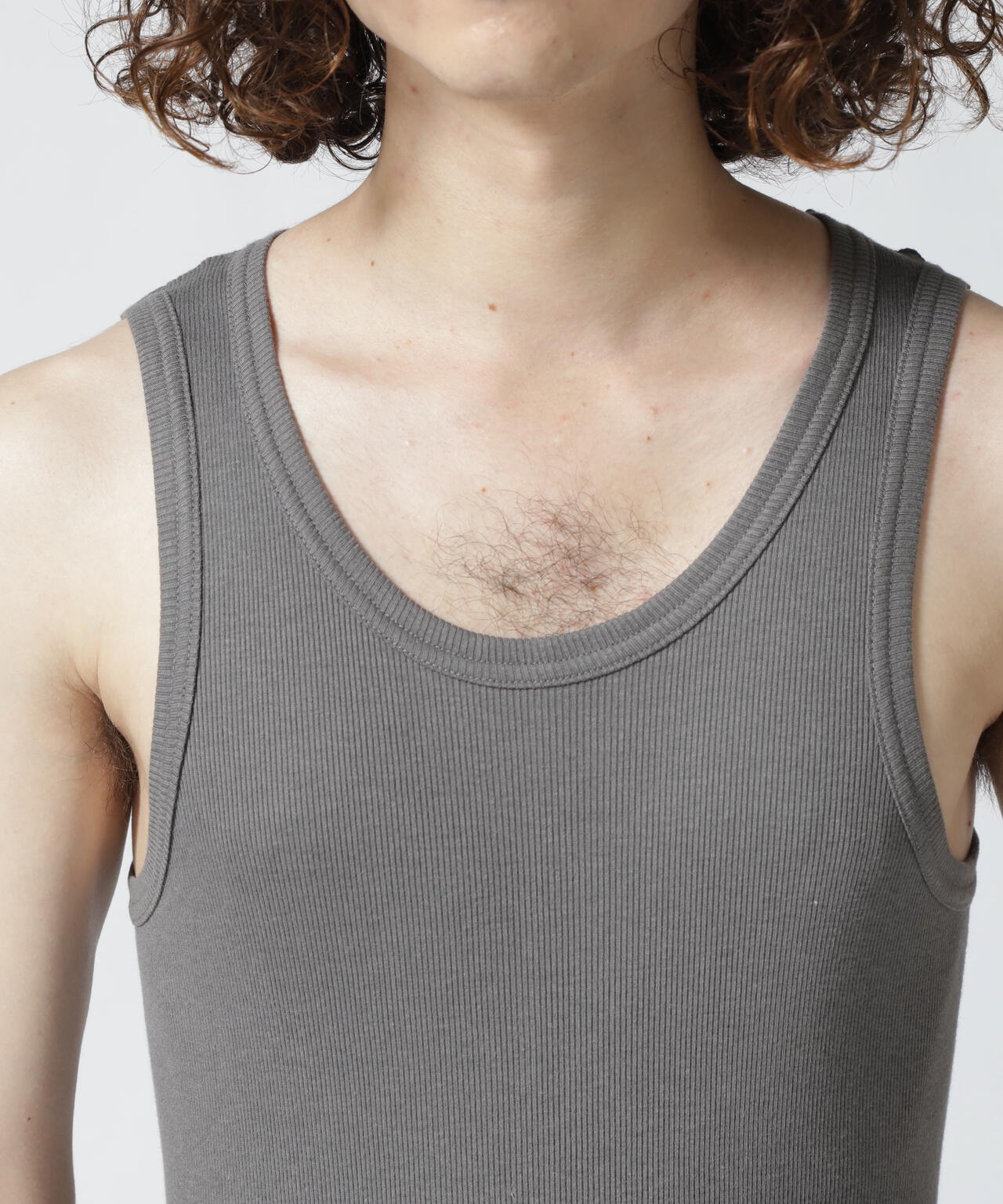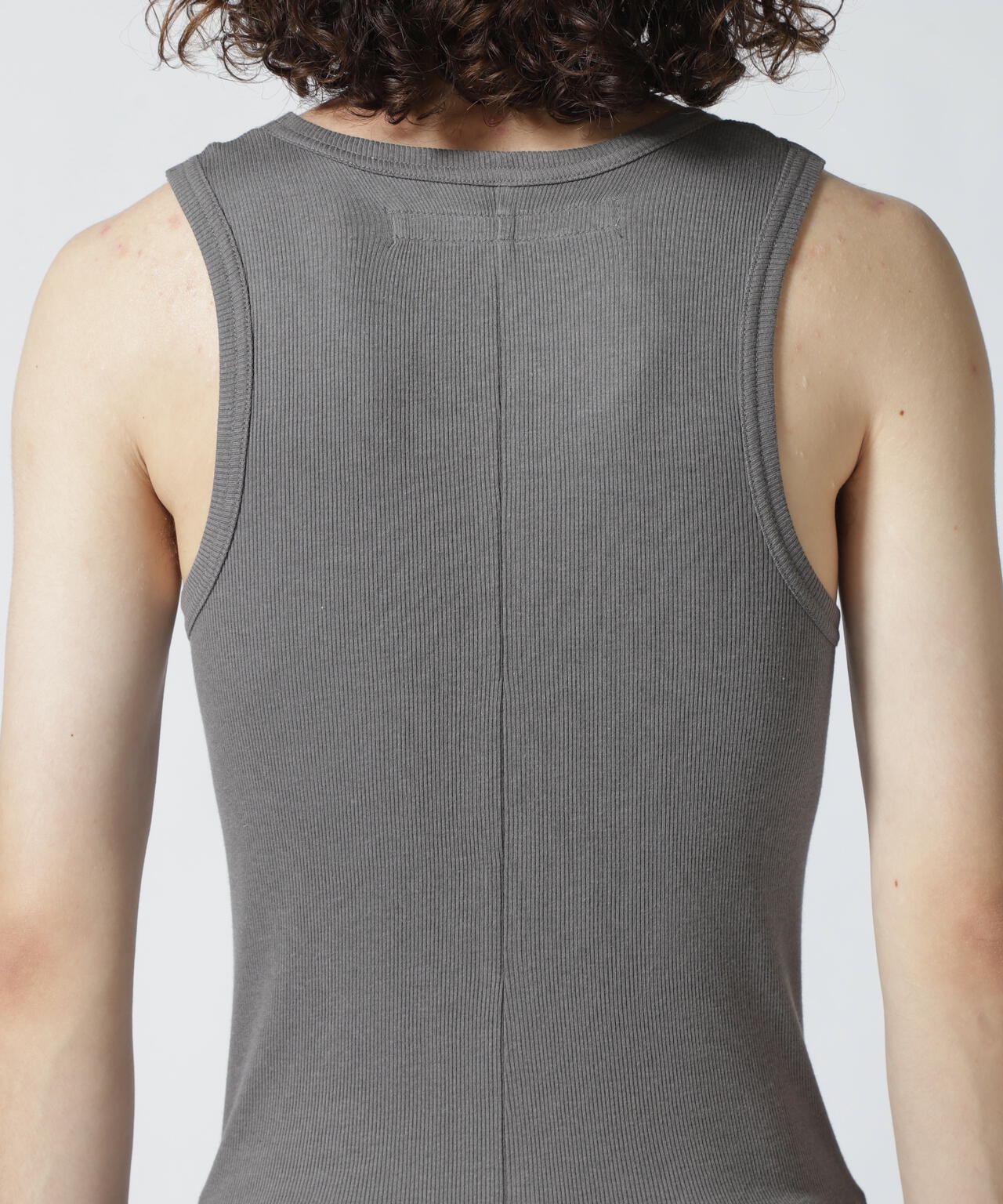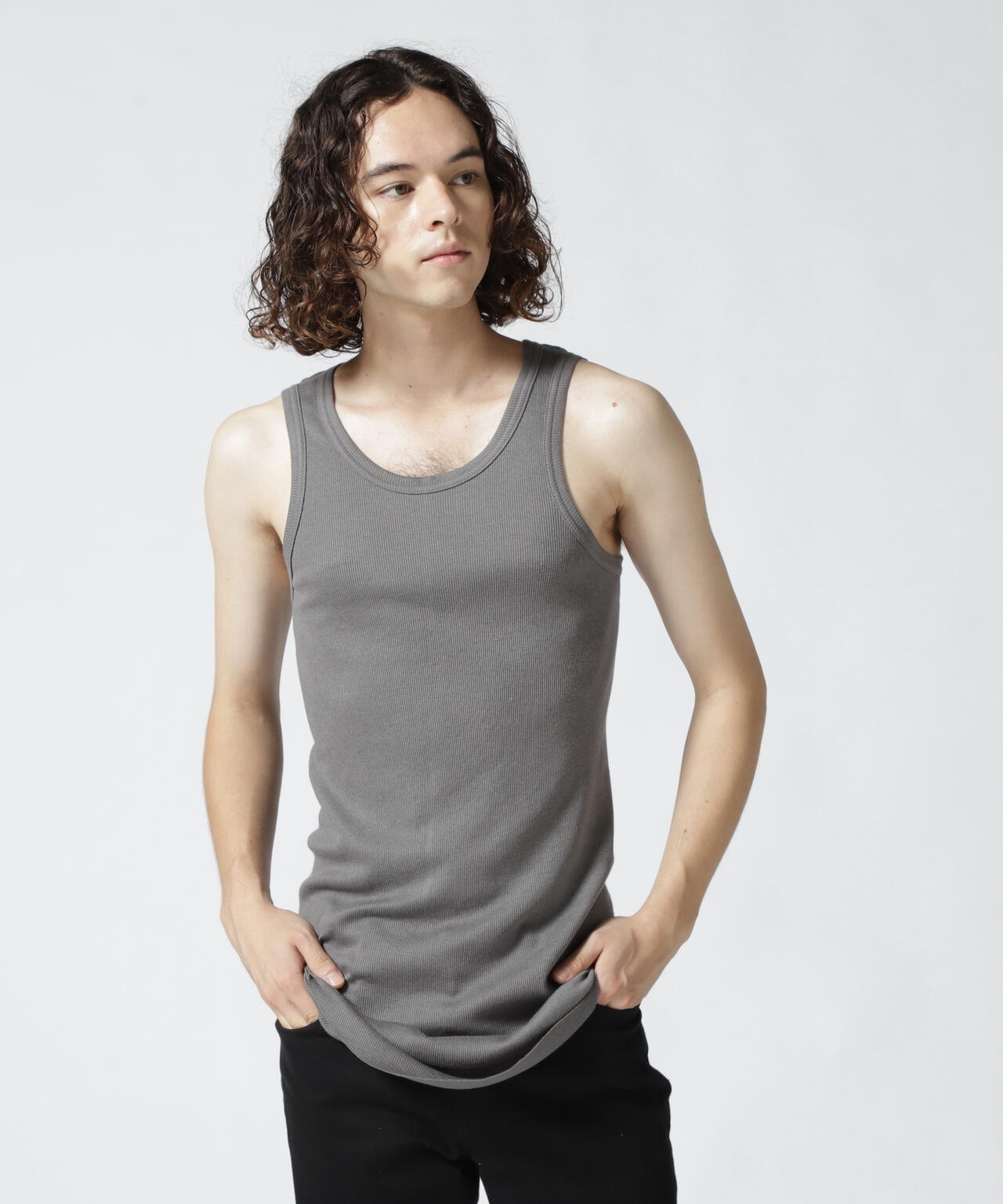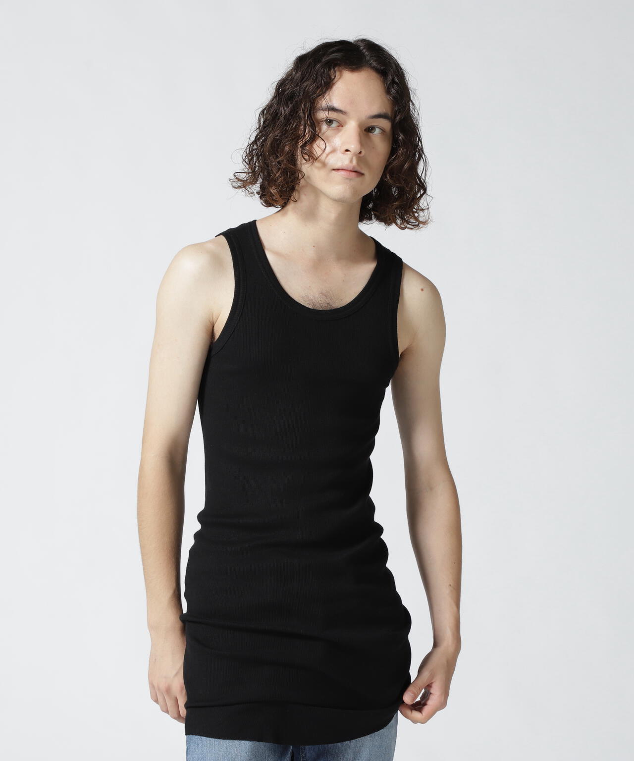 フィット感のあるシルエットに裾のラウンドしたロング丈仕様のタンクトップ。
