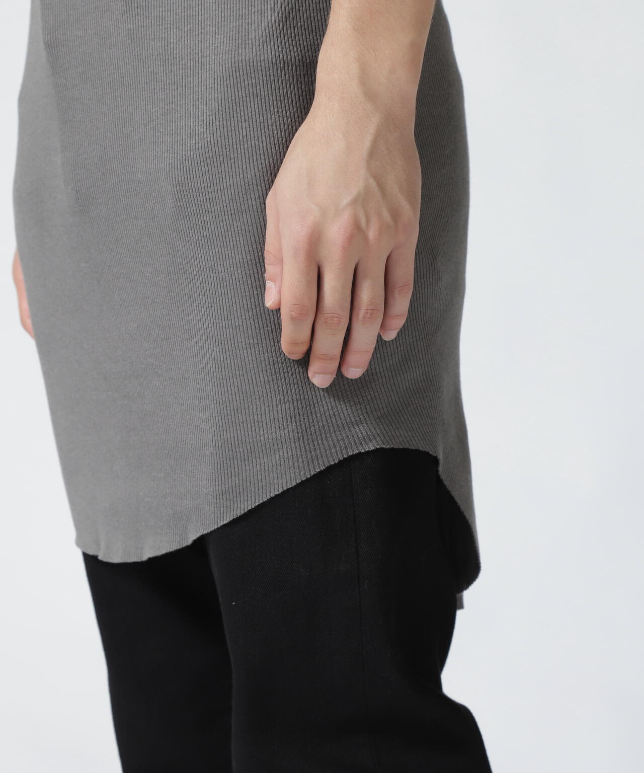 リブの伸縮性ある生地感で着心地抜群な一着です。