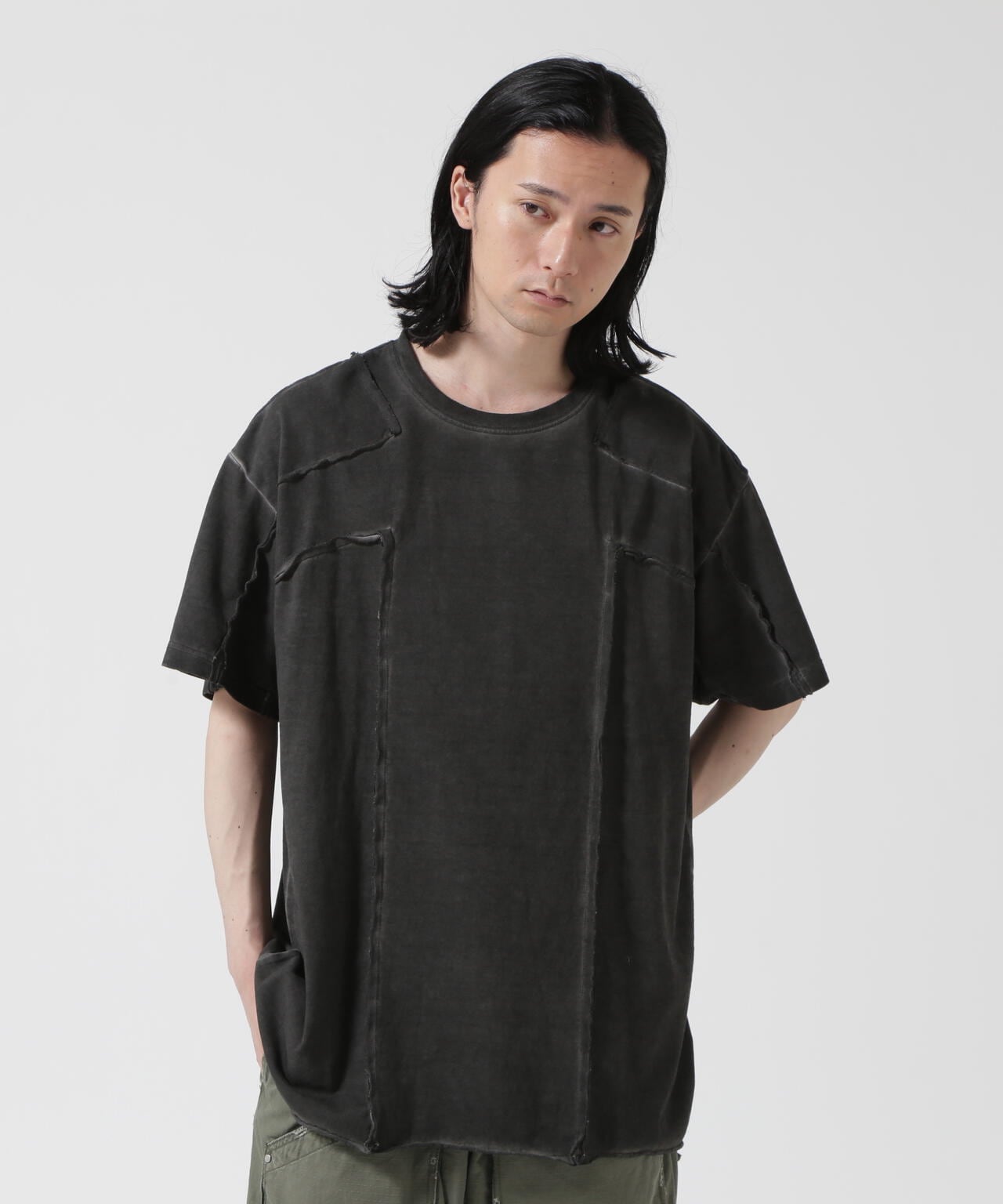 無地のシンプルなデザインですが、カッティングと染め感がデザインの特徴の一着になります。