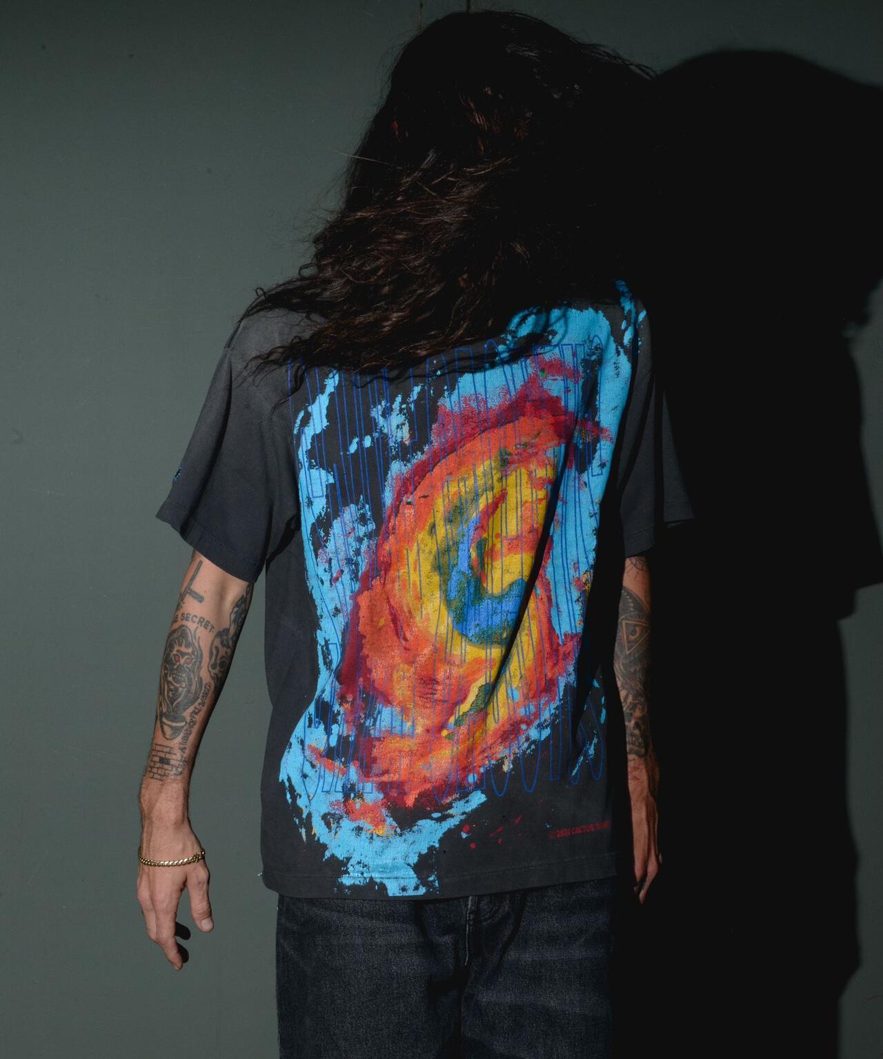 ブラックボディに映えるカラフルなカラーの配色が目を引く1枚。バックにはANGRY LOVE GODの文字がデザインされています。
