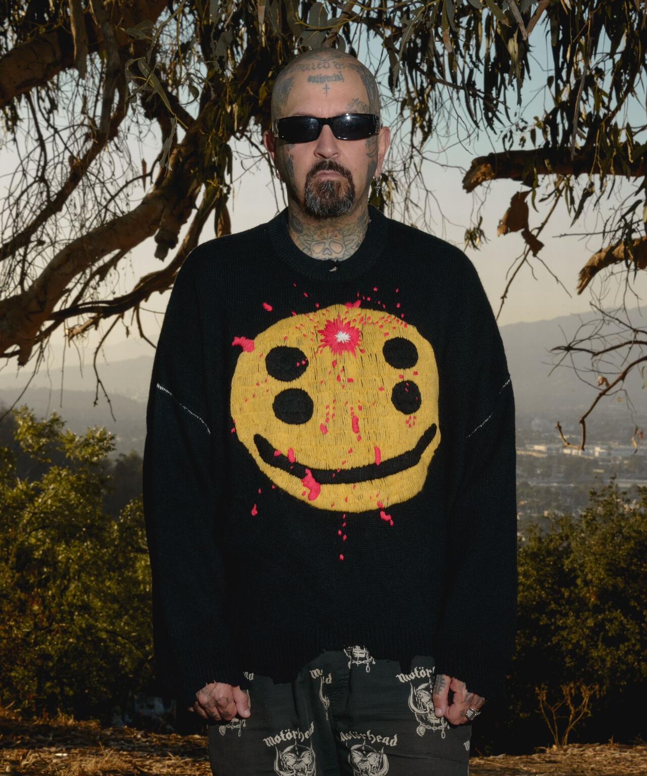 アイコニックなスマイルマークの額が撃ち抜かれたようなデザインが刺繍で表現されたクルーネックニットです。