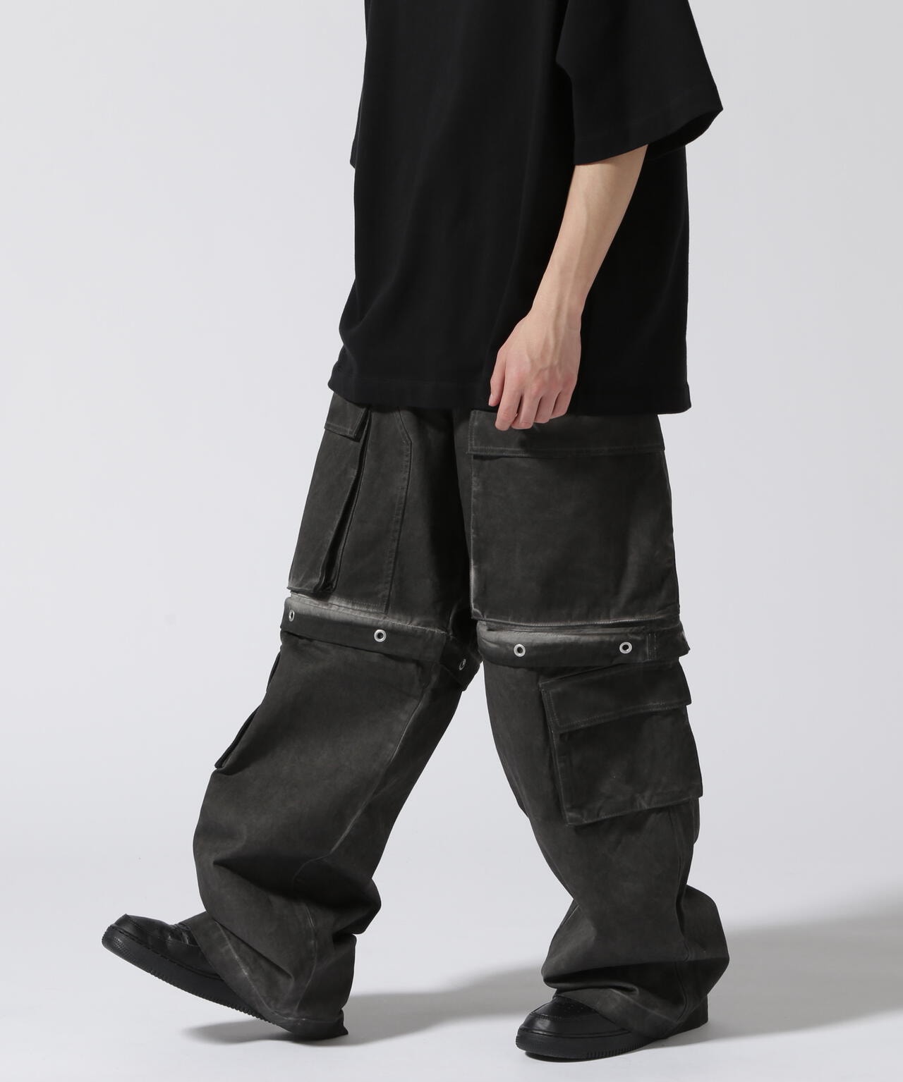 スプレーを吹きつけたようなオリジナルの加工で染める事で、独特なムラ感を残したワイドカーゴパンツ。
