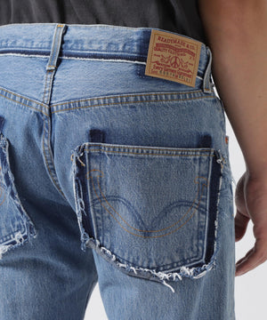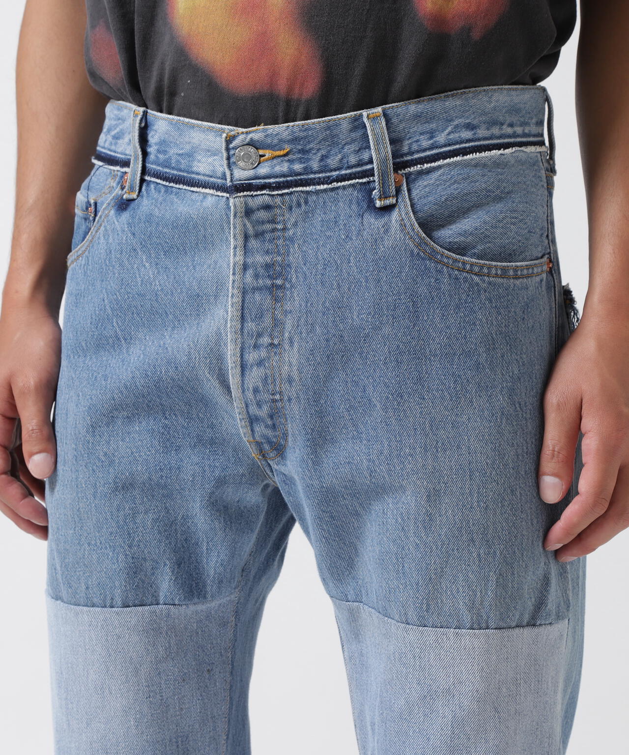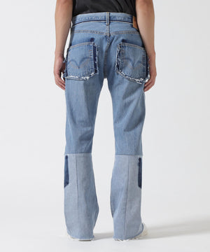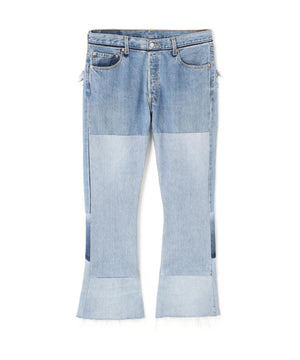 Levi's「517」を彷彿させるフレアシルエットをベースに、濃淡の異なるブルーフェード加工を重ねたリメイクならではの持味を活かした一本。