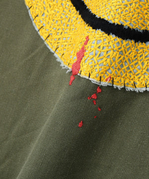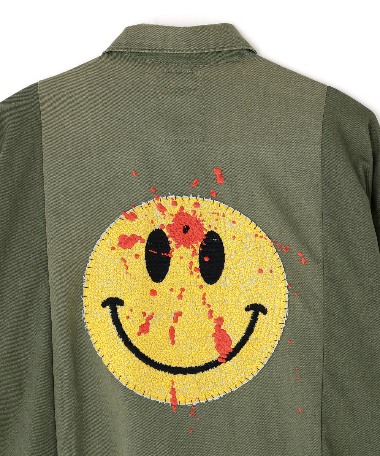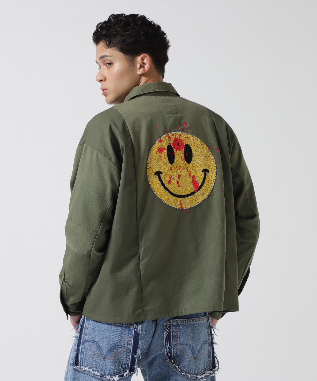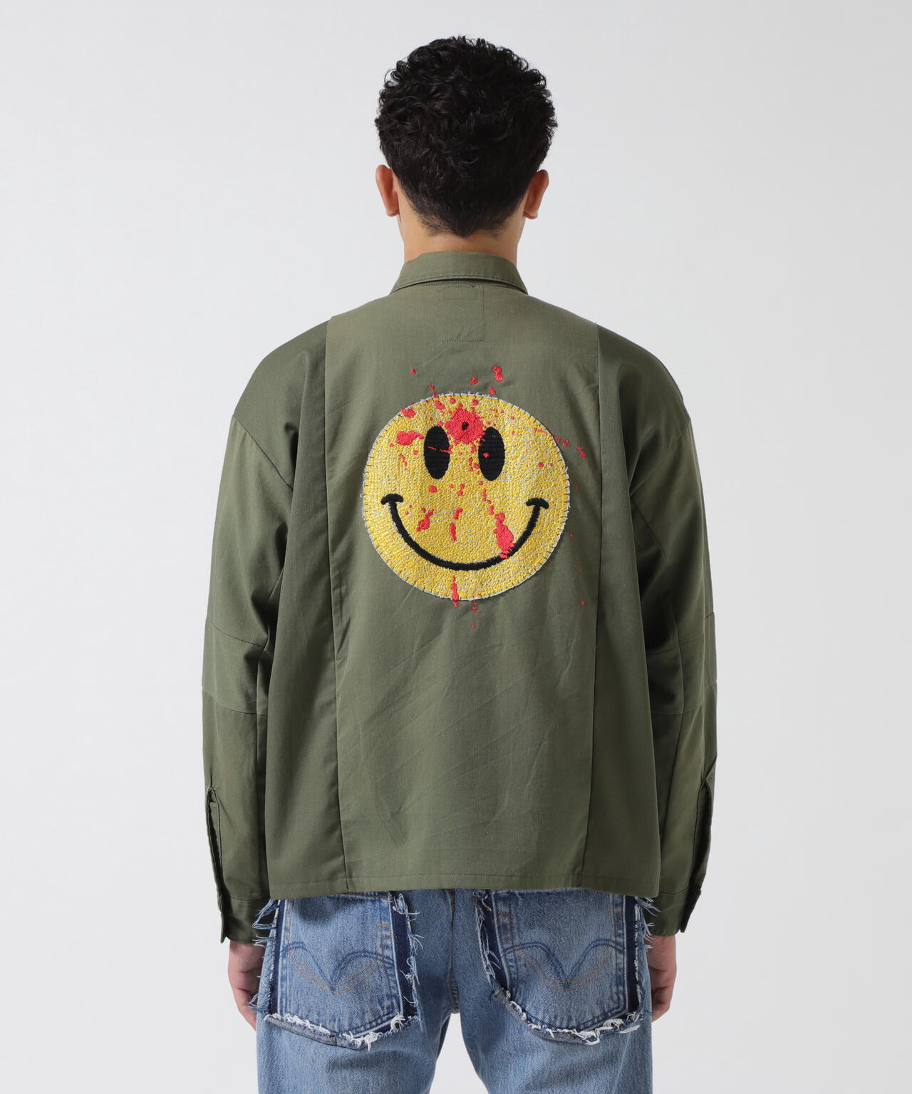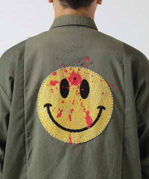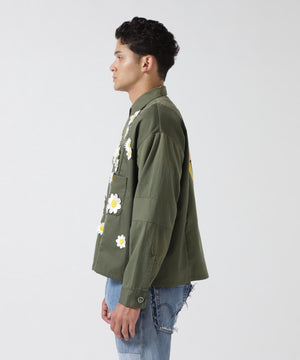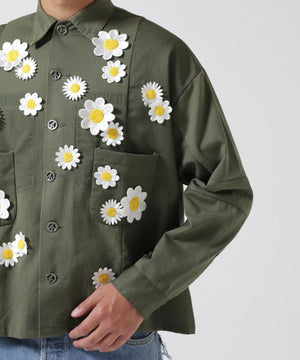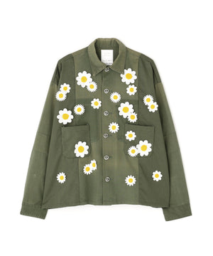 フロントにフラワーモチーフのワッペン、バックにおなじみのスマイリーの刺繍を飾ったインパクトたっぷりのミリタリーシャツ。
