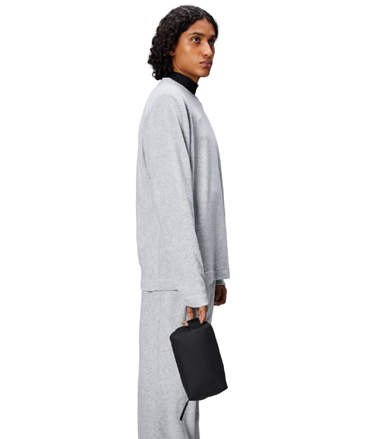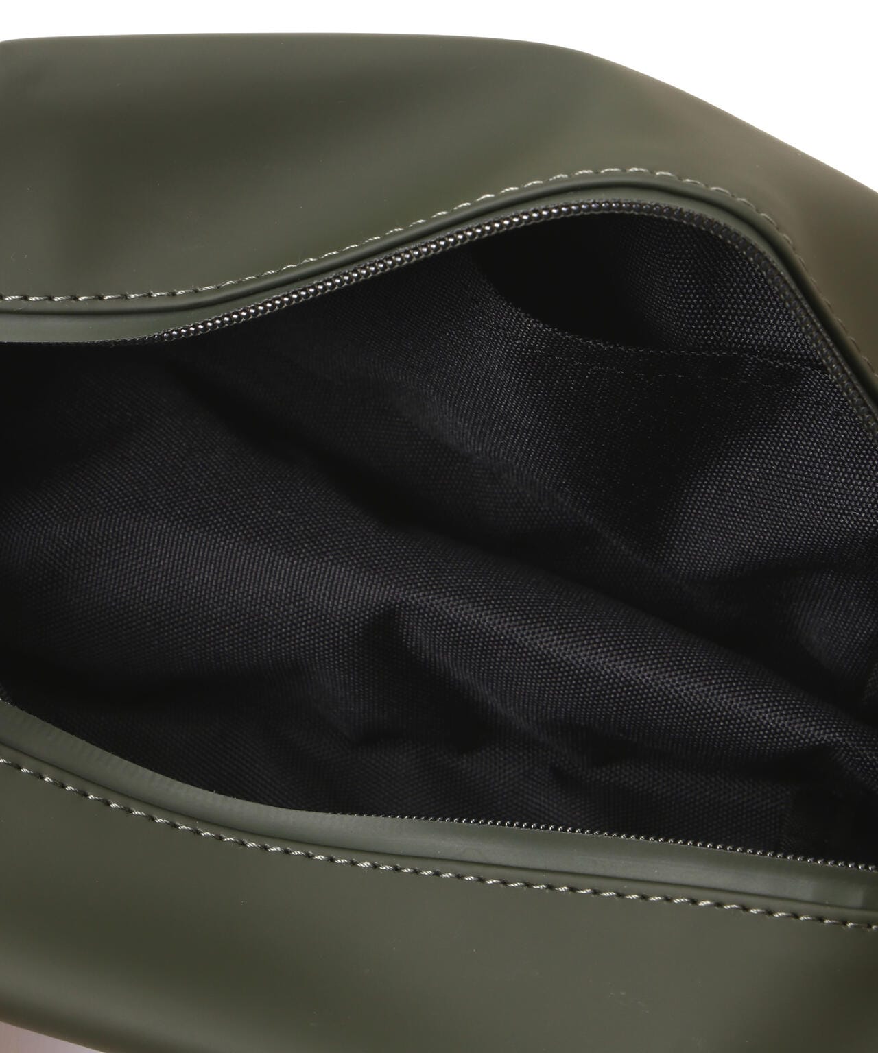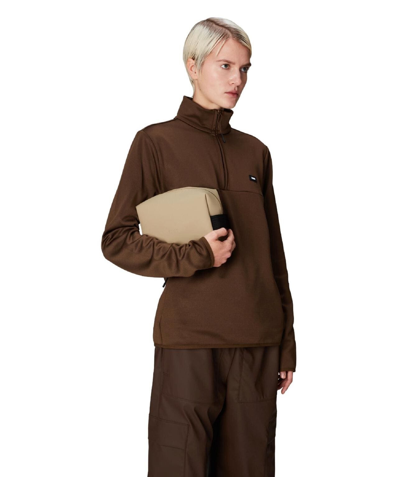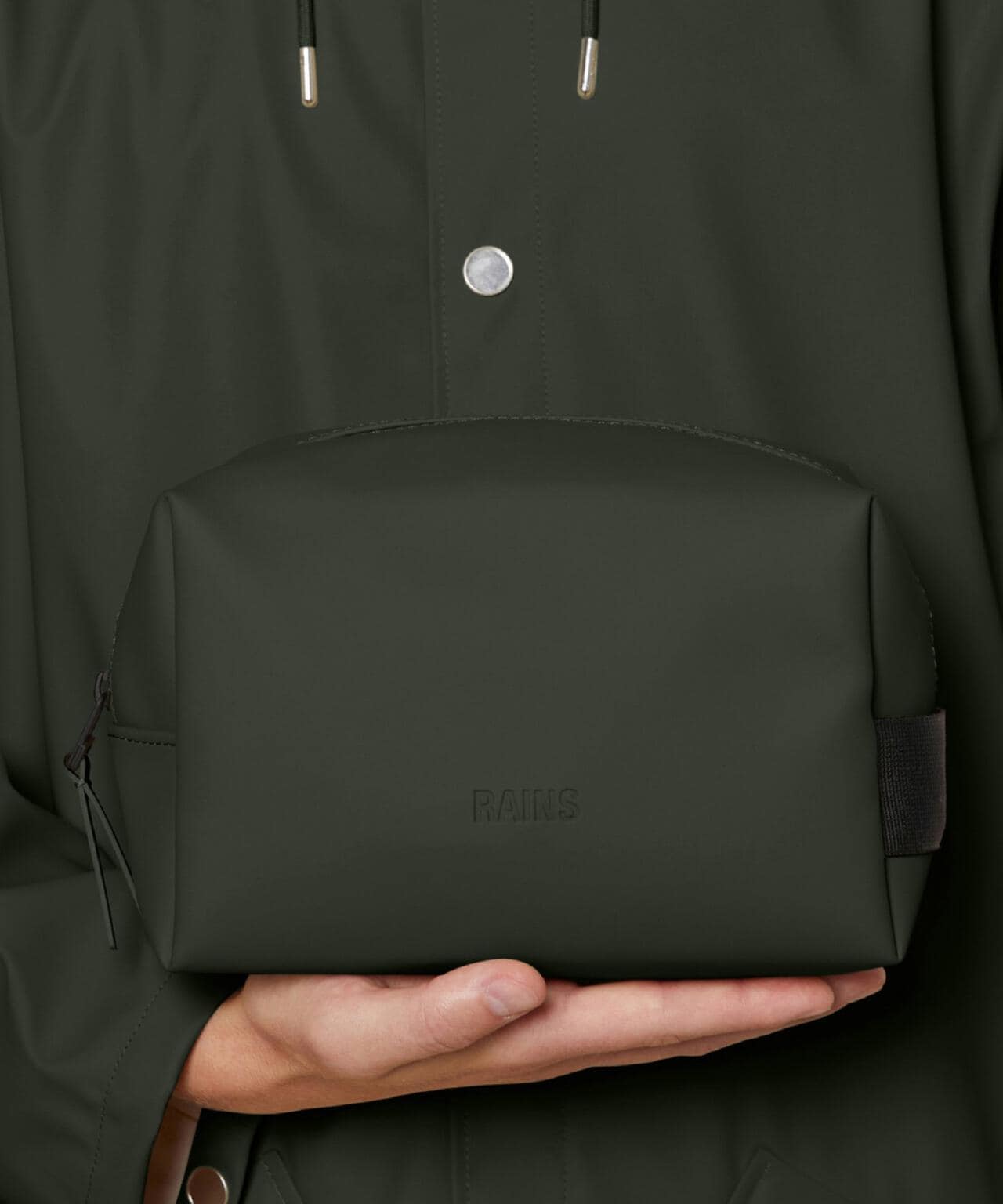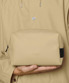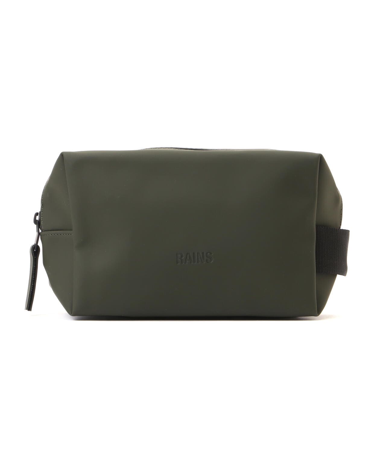 ウォッシュ バッグ スモールは、Rainsのシグネチャーであるウォータープルーフ加工を施したPUファブリックを使用。