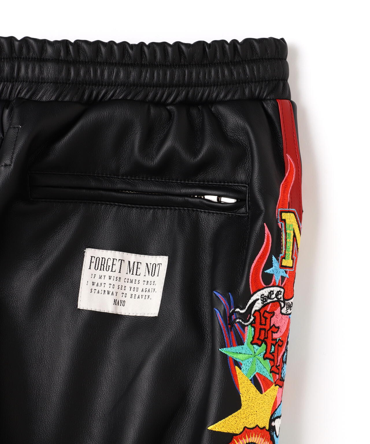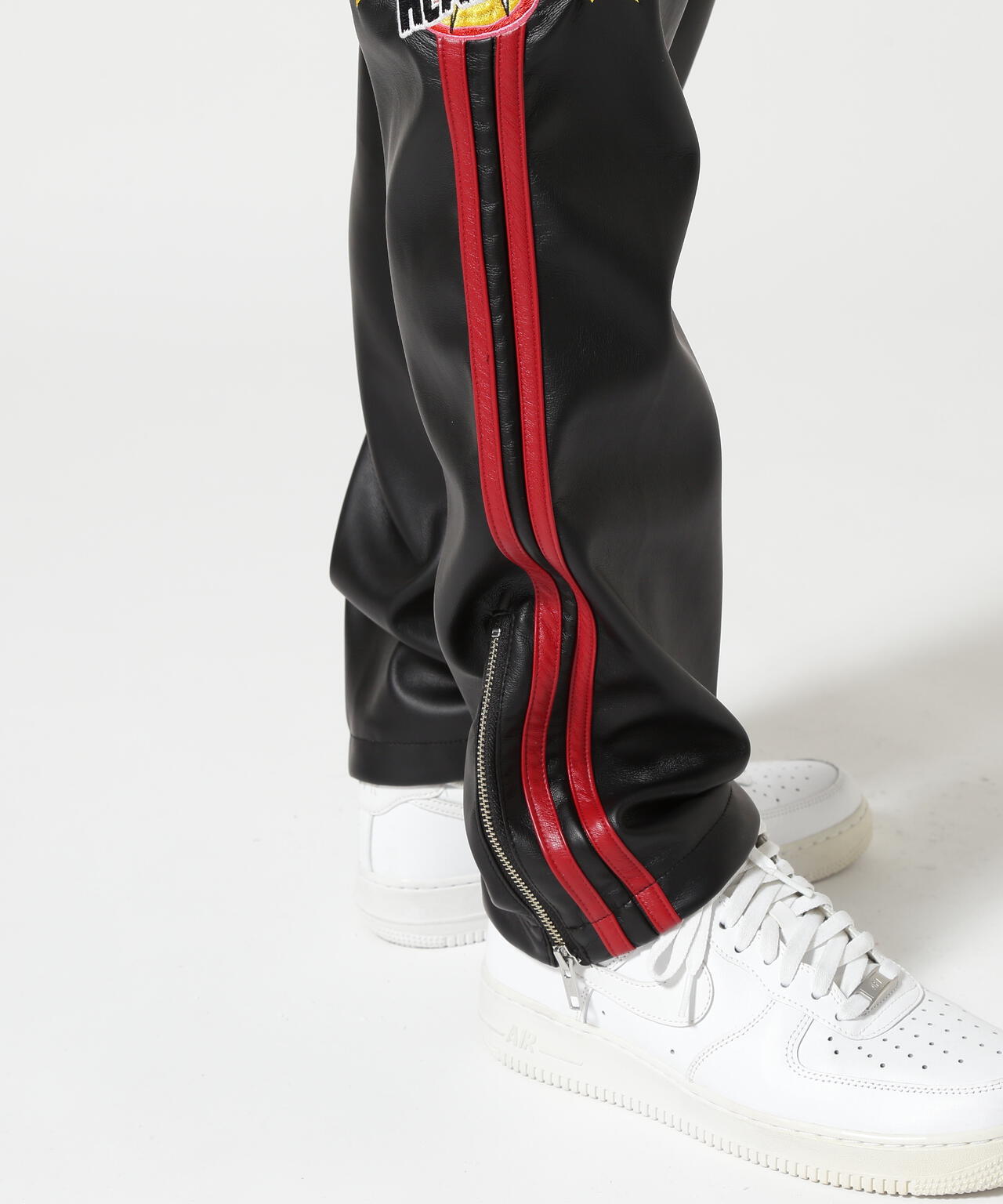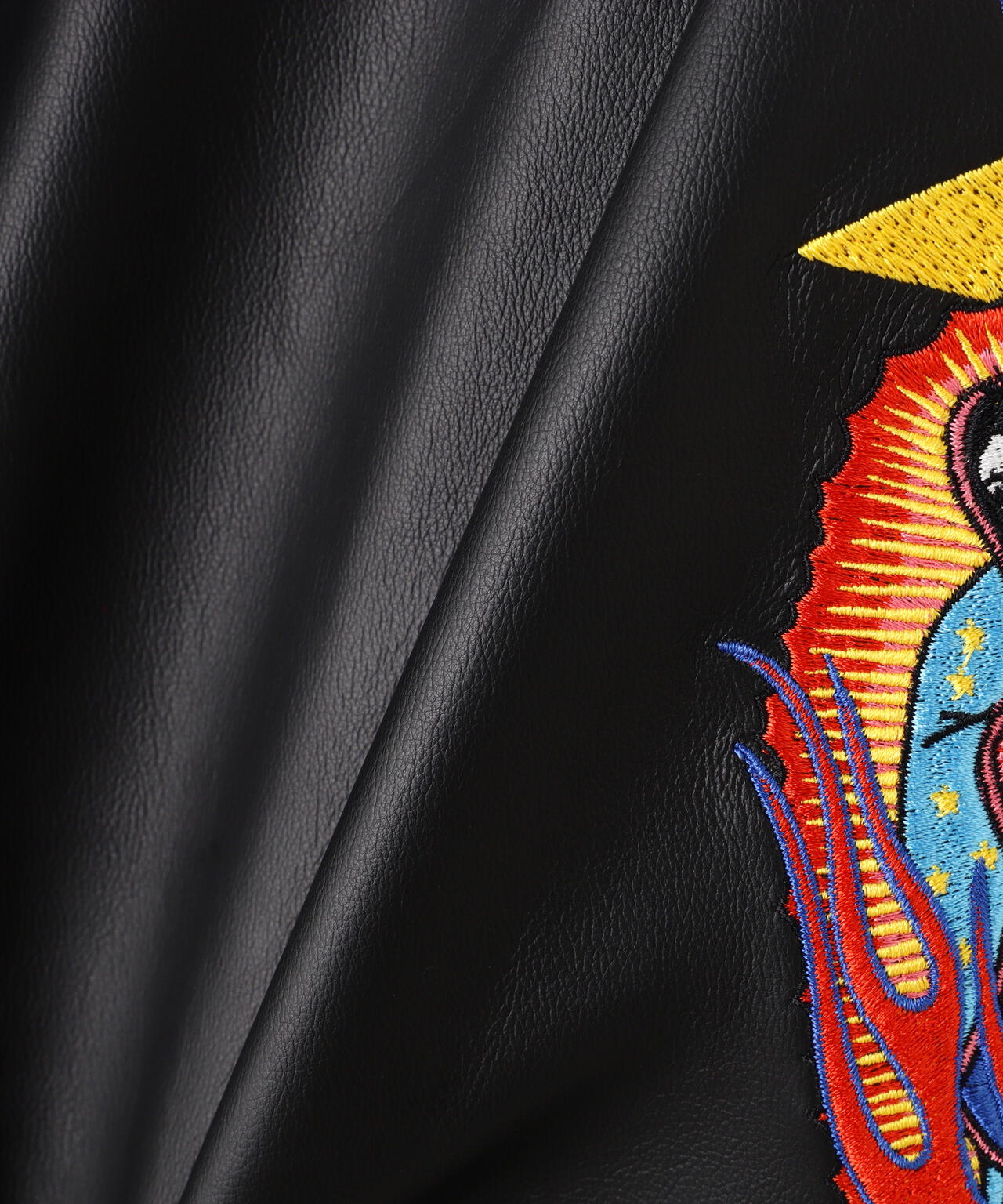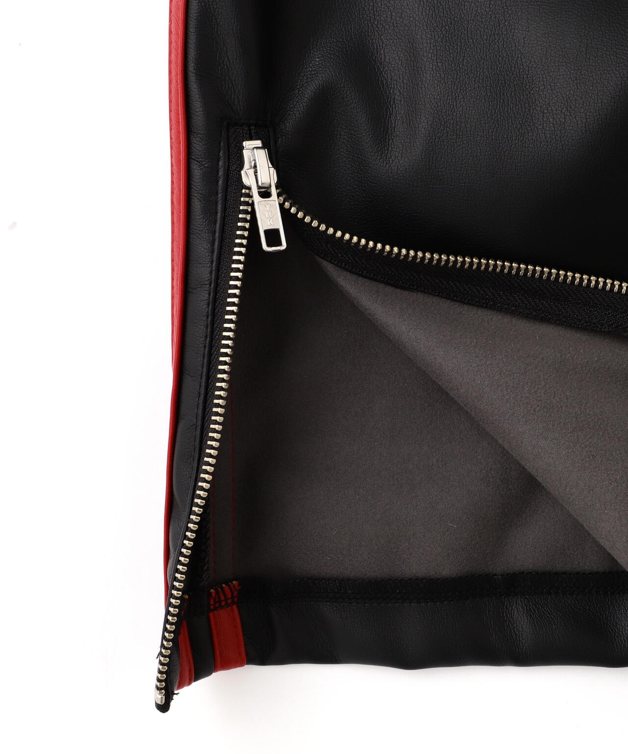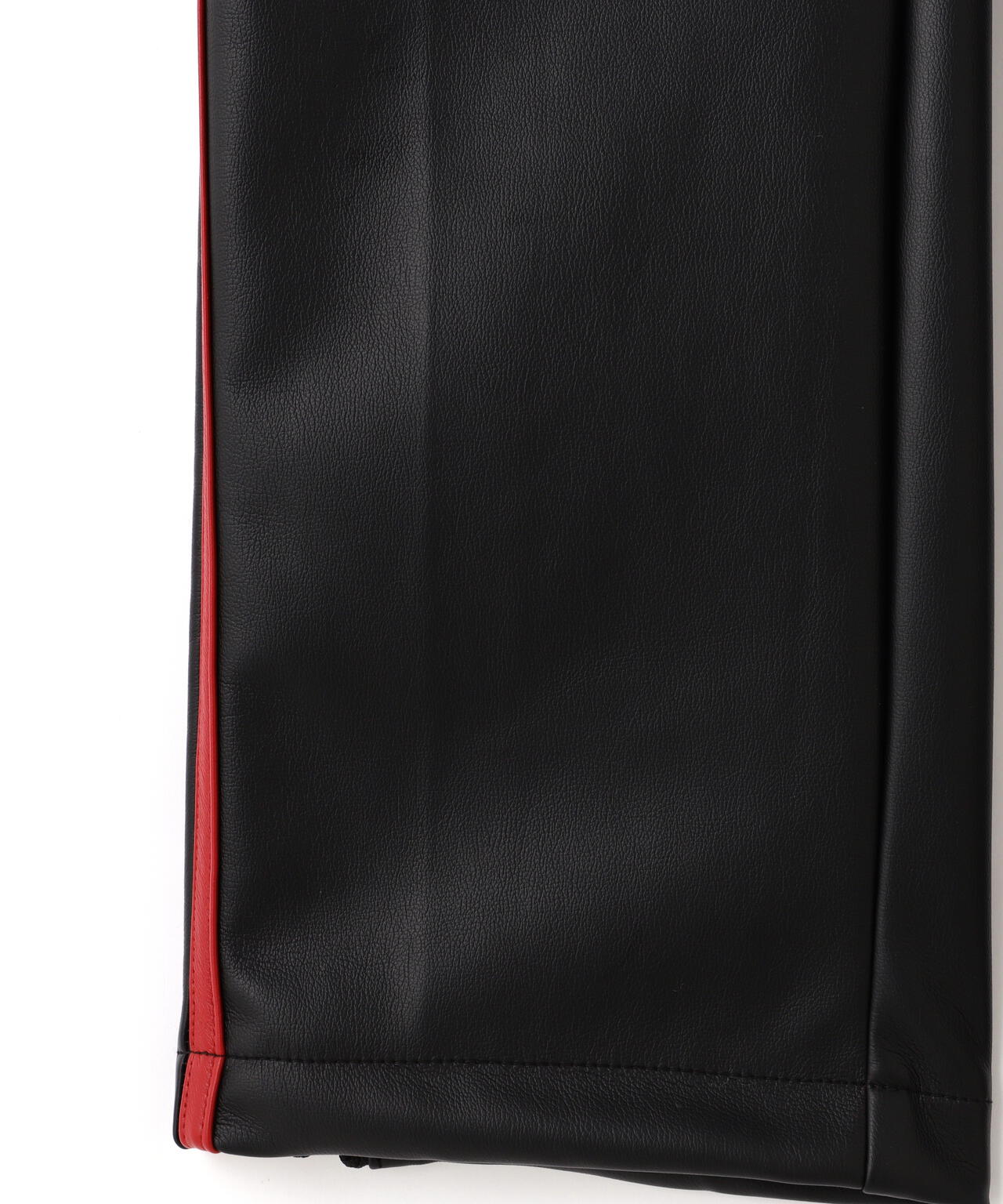 サイドのライン上に配置されたワッペンが存在感あるPUレザーの1着。