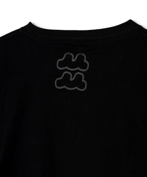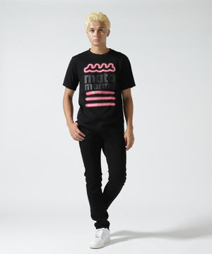 フロントはネオン管をイメージしたスプレープリントで波モチーフを表現、ブランドロゴは厚盛りラバープリントで立体感が出るようにプリントを組み合わせてます。