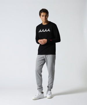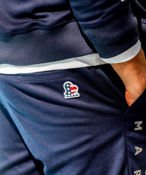 ブランドモチーフとロゴを厚盛りメタルシリコンプリントを両モモ部分に配置。