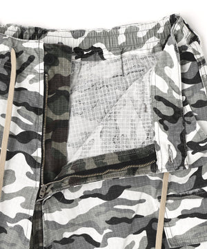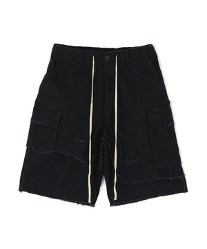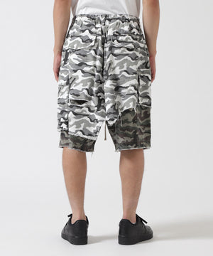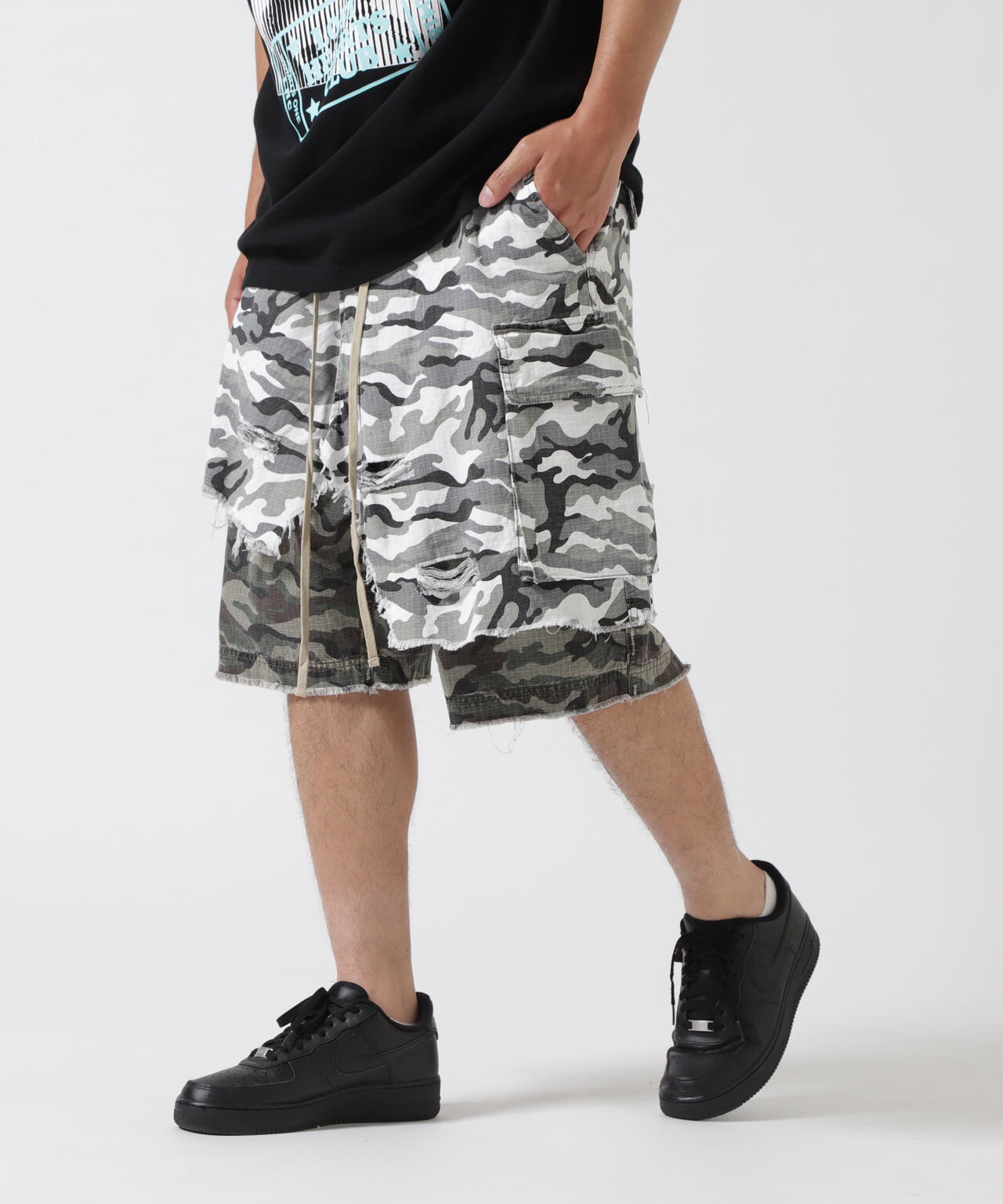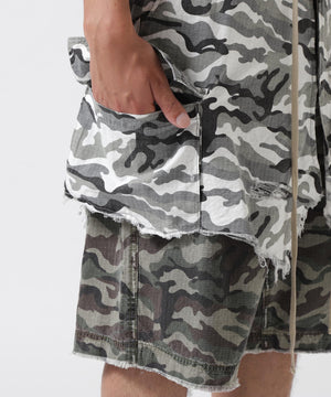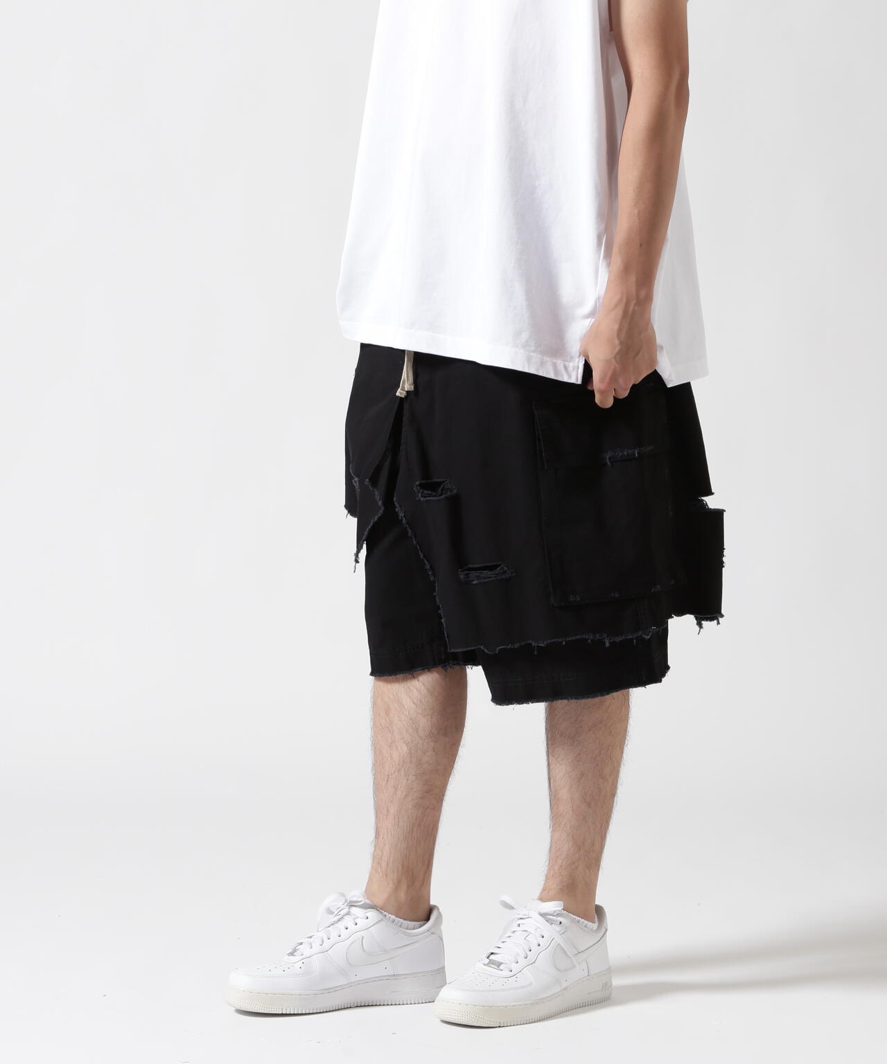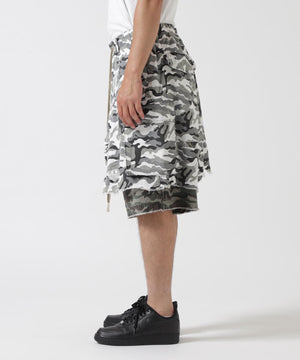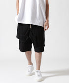 異なる長さのテキスタイルをレイヤードしたユニークなデザインが目を惹くカーゴショーツ。
