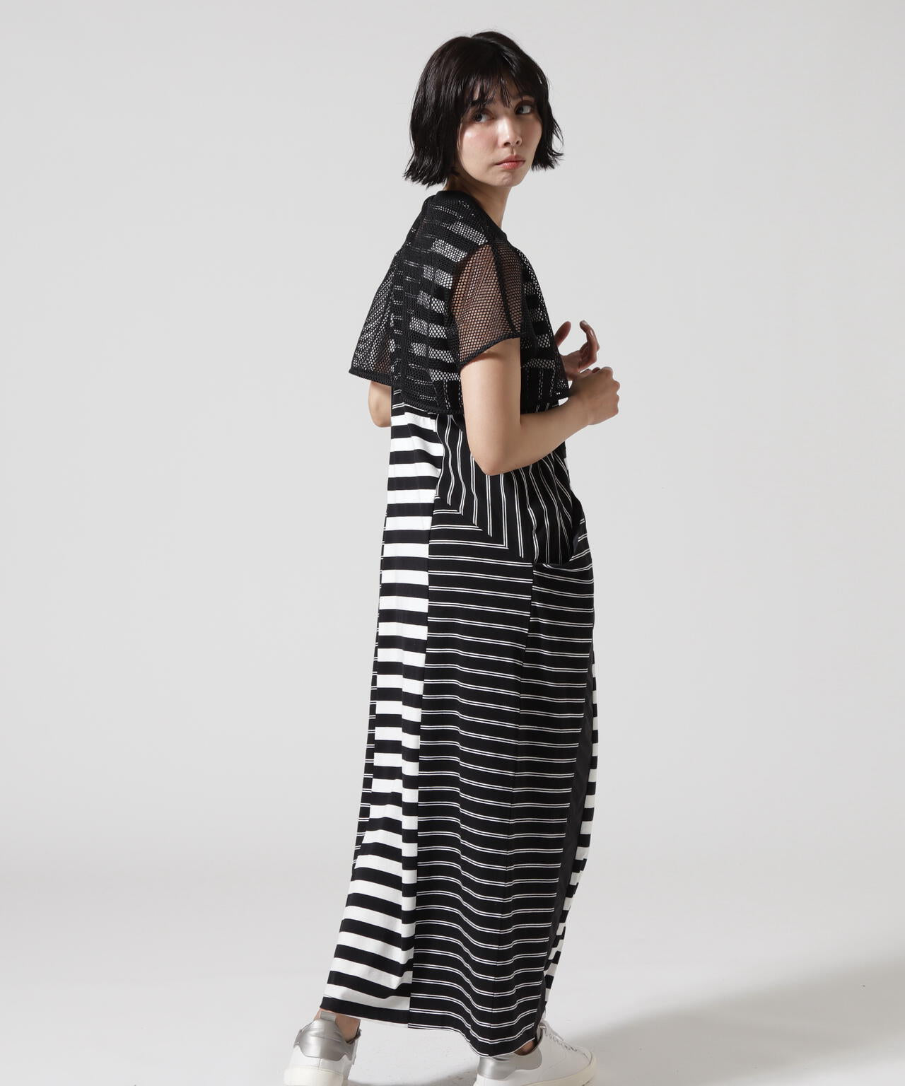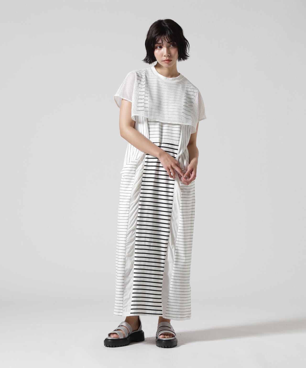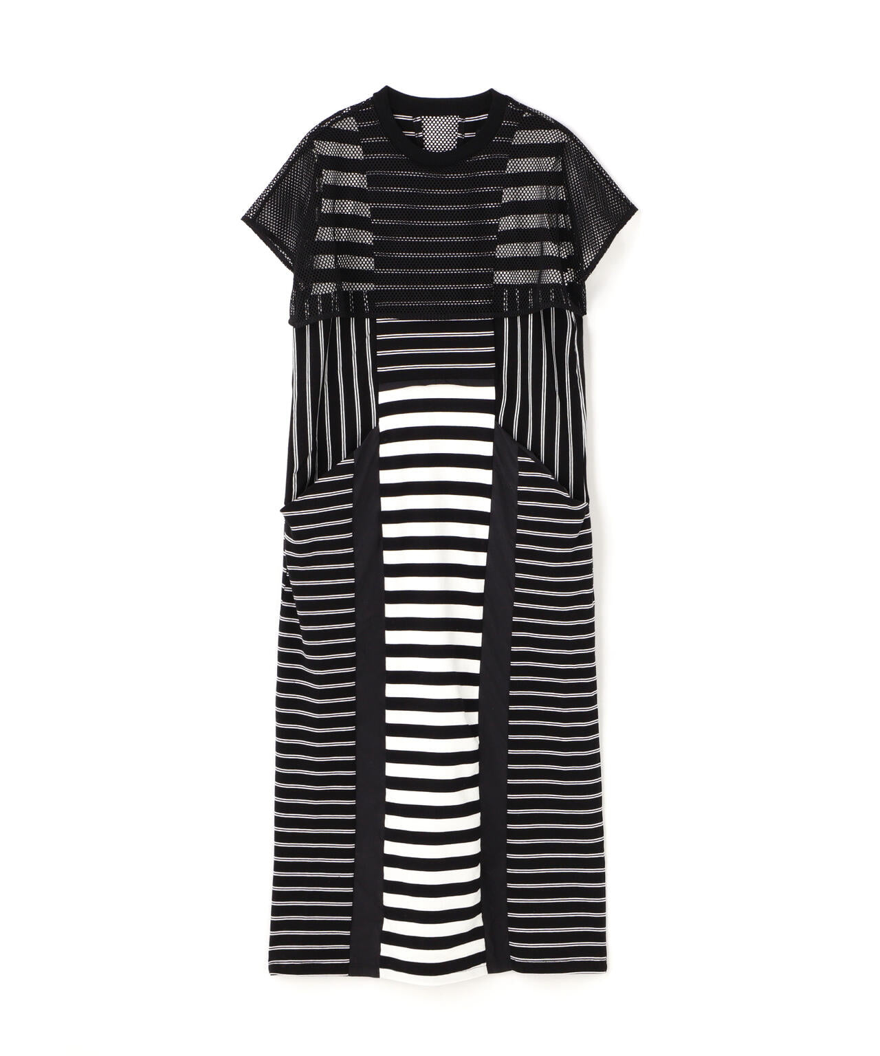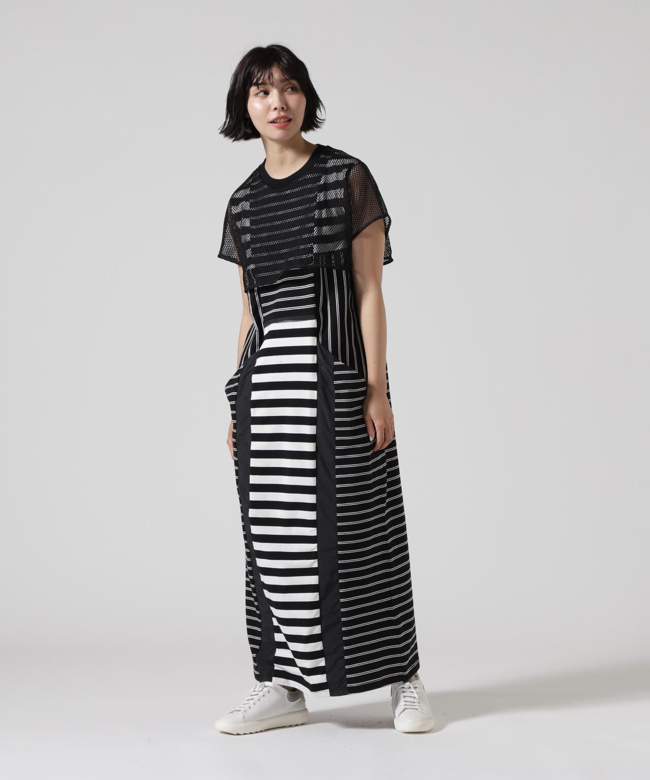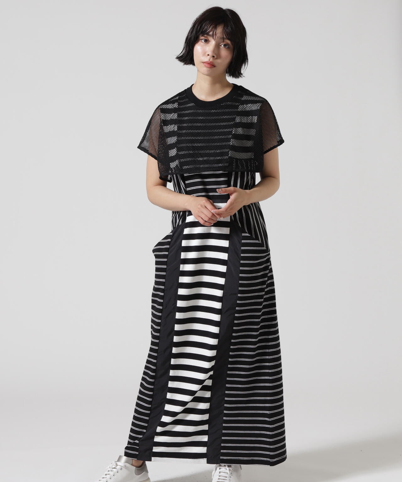 ピッチの異なる2種類のボーダーと無地、さらには涼しげなタフタやメッシュなど、様々な素材を組み合わせたインパクトのあるワンピース。