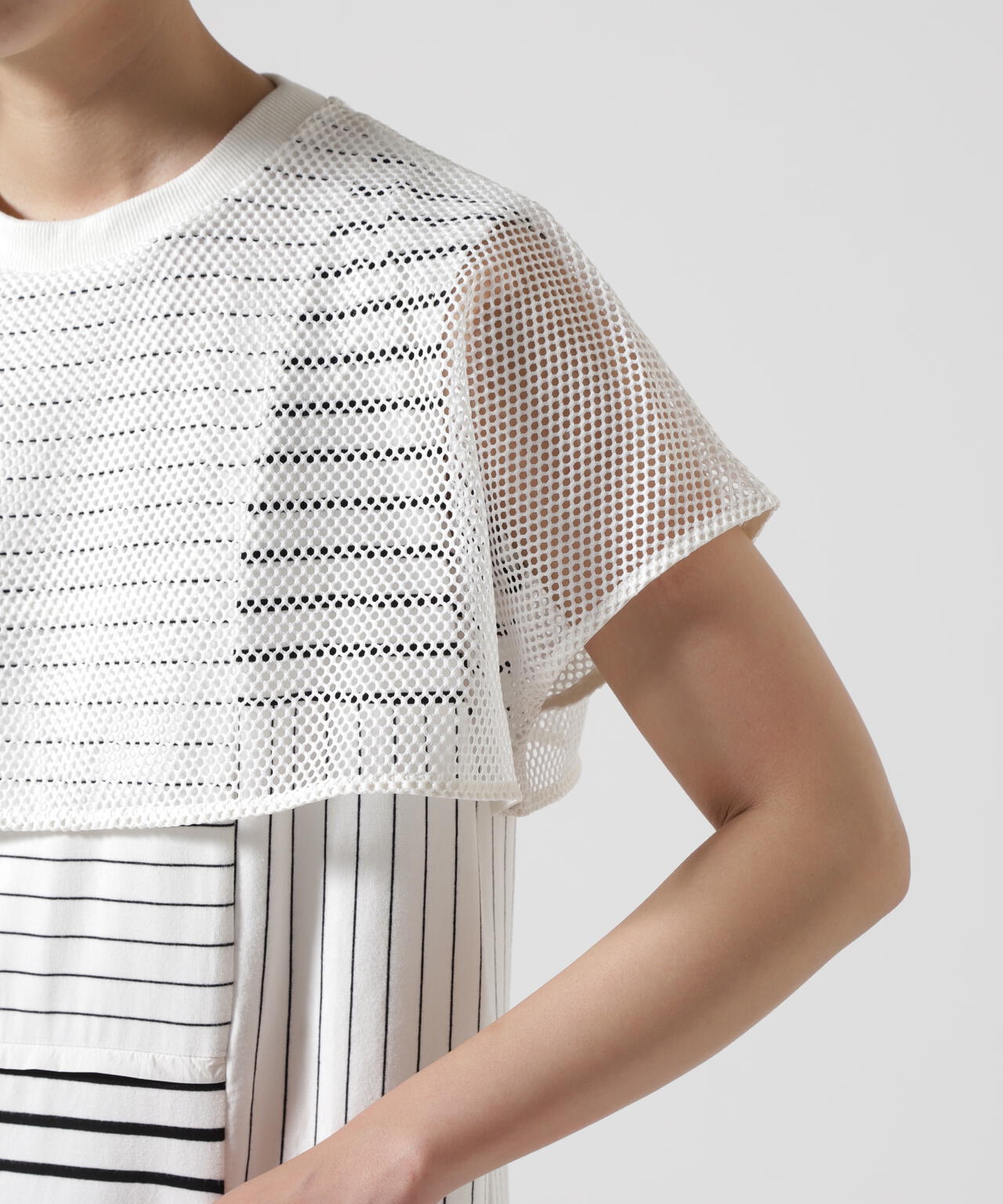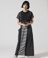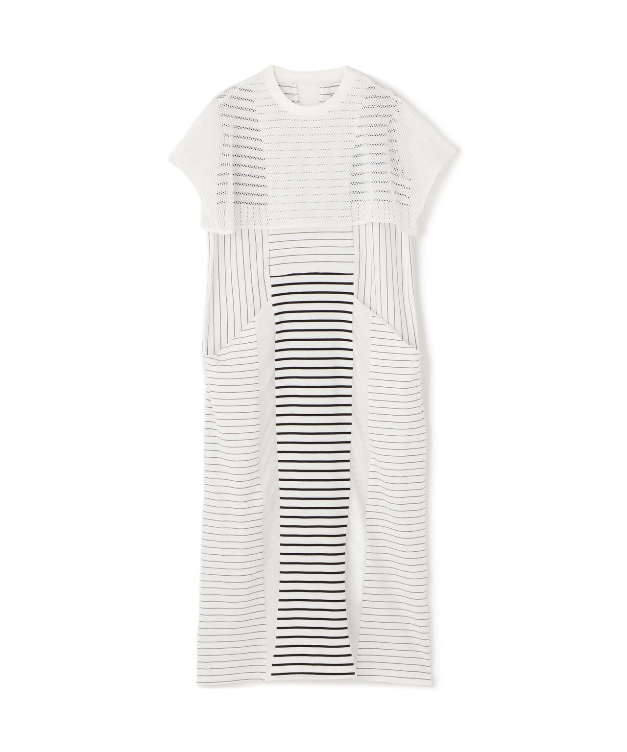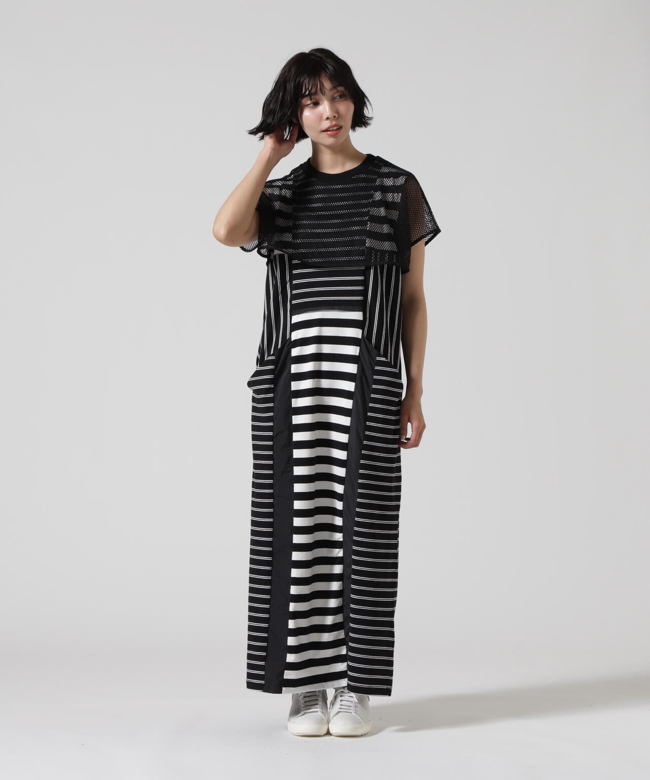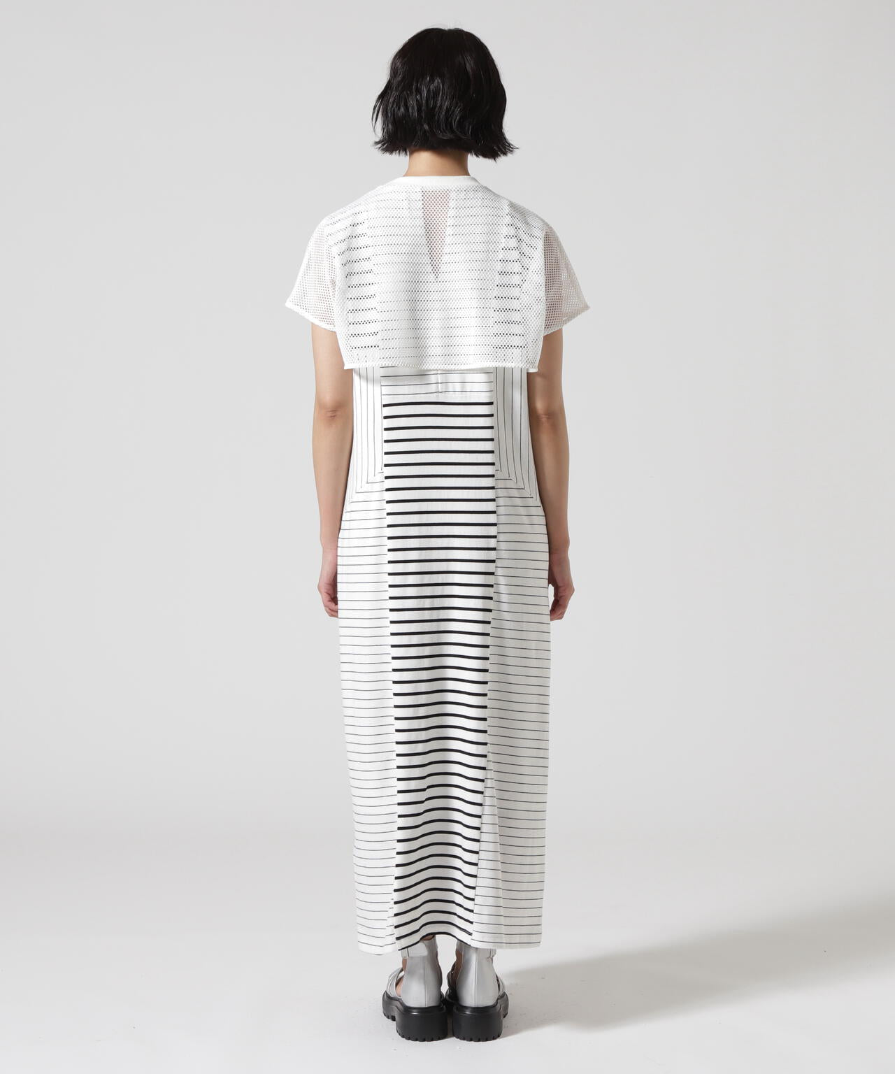 ピッチの異なる2種類のボーダーと無地、さらには涼しげなタフタやメッシュなど、様々な素材を組み合わせたインパクトのあるワンピース。