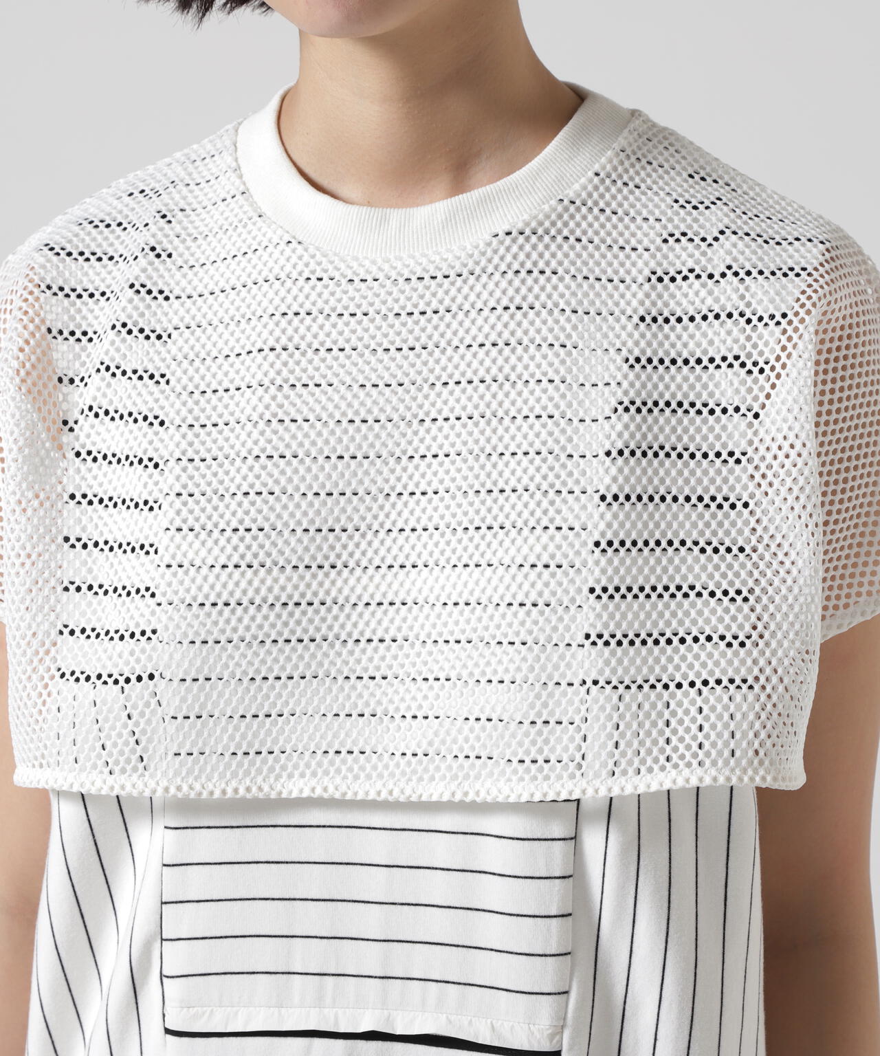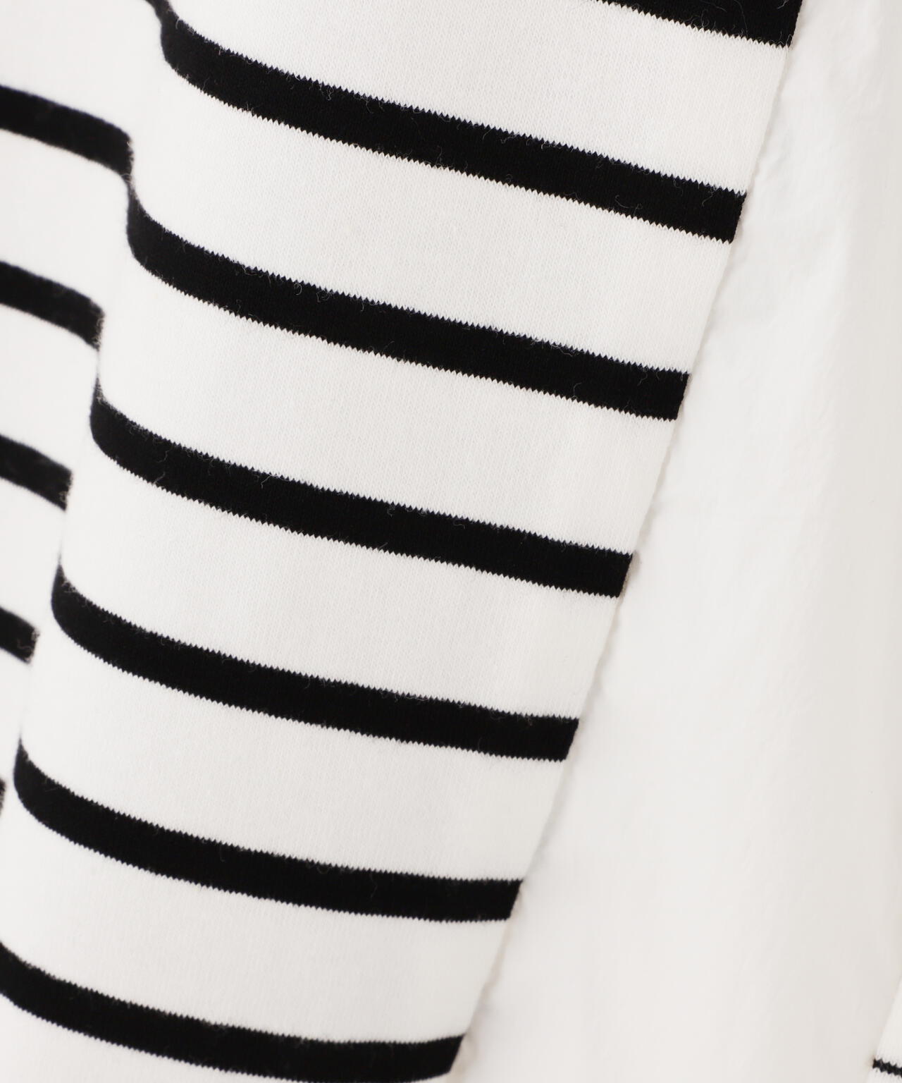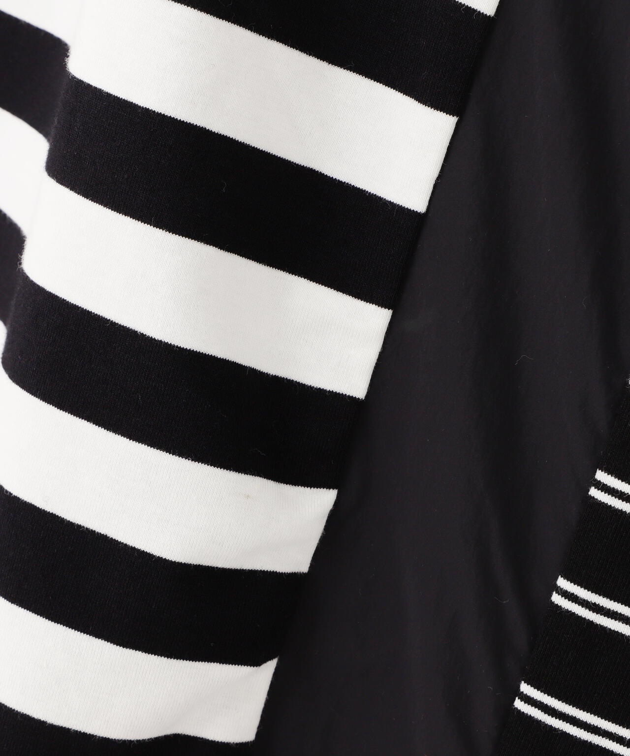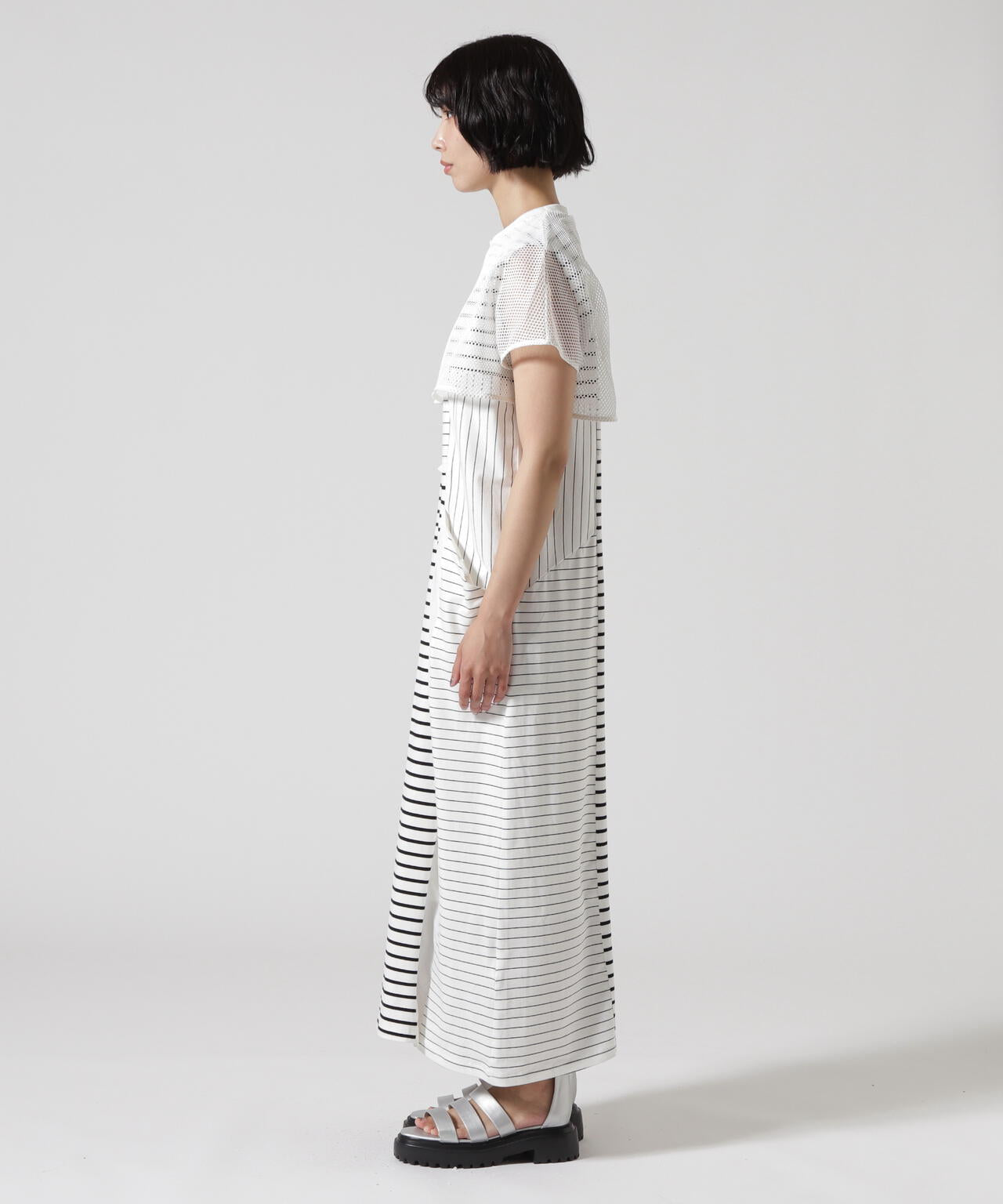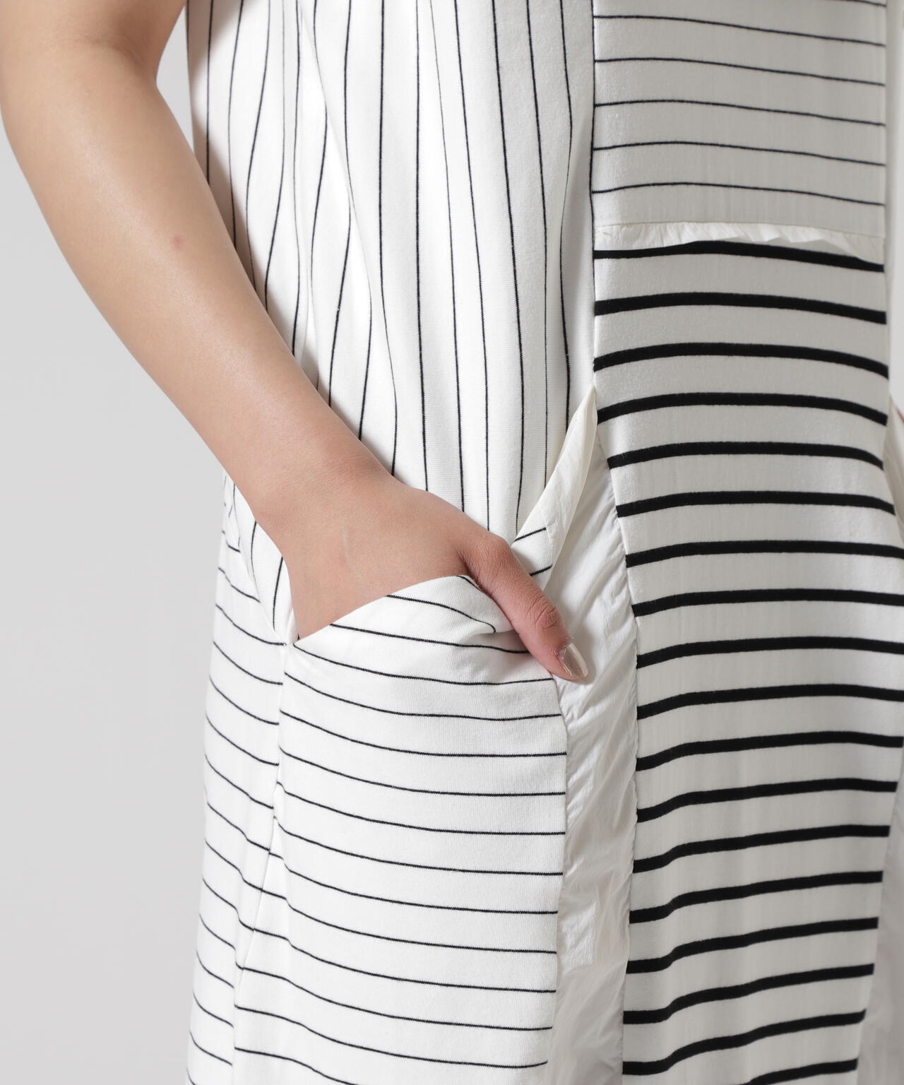 ピッチの異なる2種類のボーダーと無地、さらには涼しげなタフタやメッシュなど、様々な素材を組み合わせたインパクトのあるワンピース。