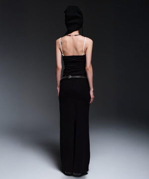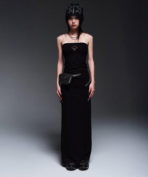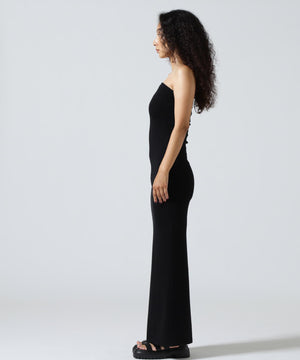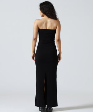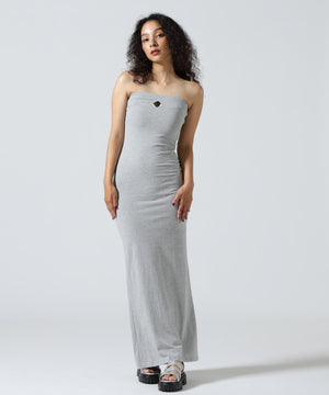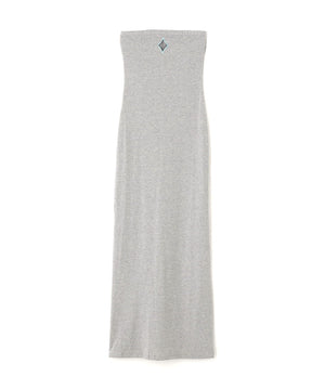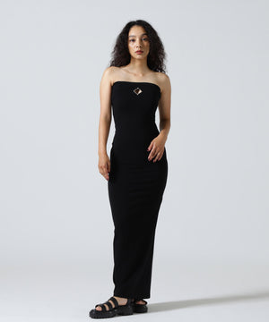 胸元にダイヤモンドカットが入ったベアトップタイトワンピース。