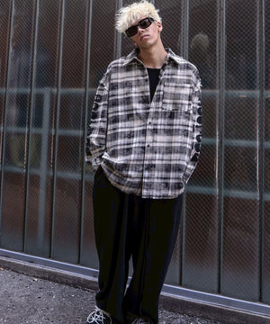 襟や袖口や袖の付け根や裾など、全体的に裁ち切りデザインでダメージ風なデザインになっています。