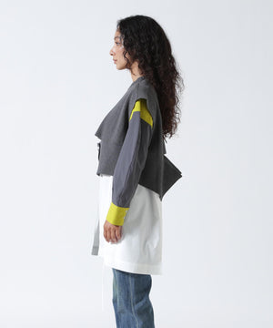 ボリューミーで構築的な袖は、切り替えを入れ素材や色を変えてレイヤードしているように見えるのもポイント。