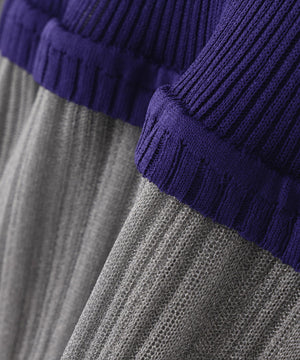 ランダムリブのインナーニットは、細い光沢のある糸でシアー感があり、ドライタッチで軽い。袖山には、3本ライン、袖口には2本ライン、襟ぐりには1本ラインを入れてトラッドな雰囲気に。