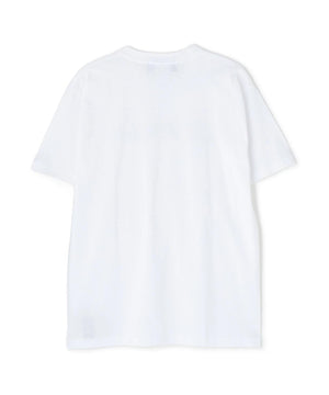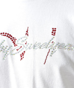 筆記体のブランドロゴとラインストーンを組み合わせたデザインが目を引くTシャツ。