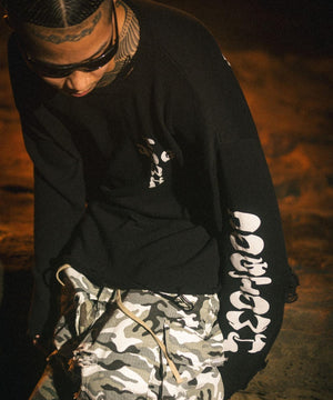 ドッグダウンのグラフィックがフロント胸と袖・バックに配置されています。