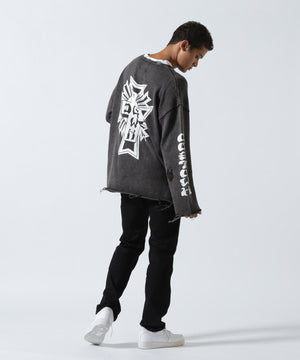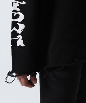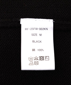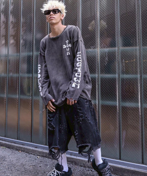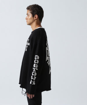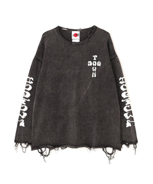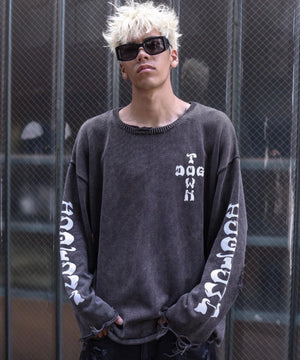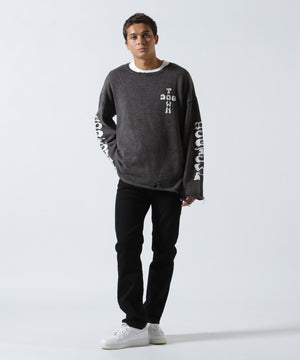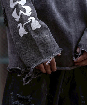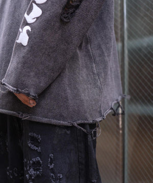 薄手のコットンニットでネック回りと袖口・裾部分と肘にダメージ加工が施されています。