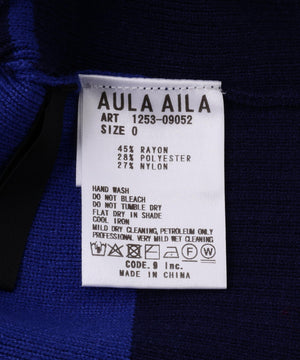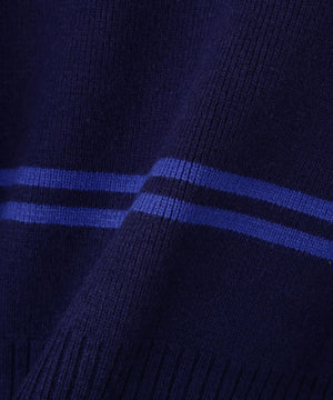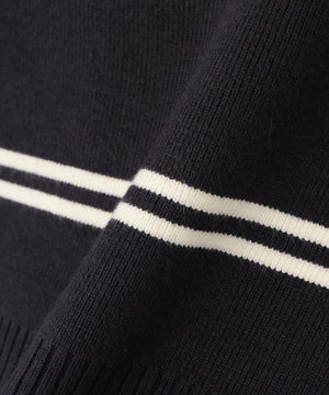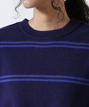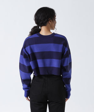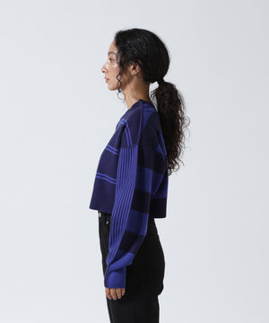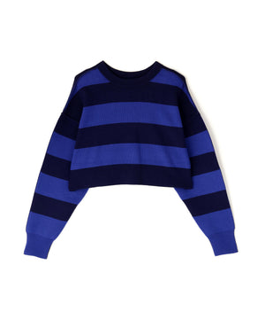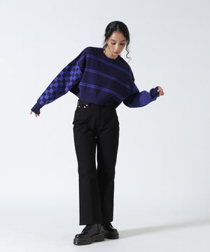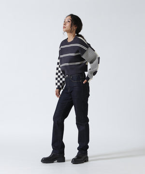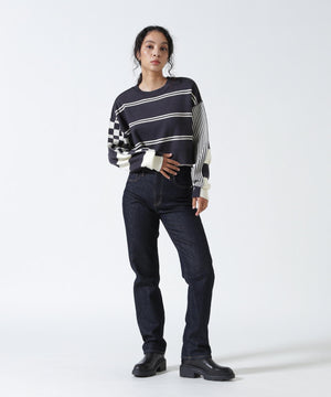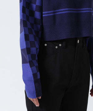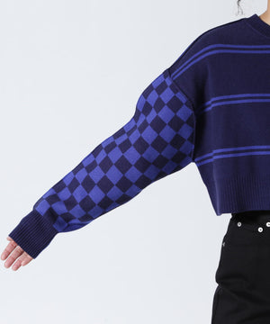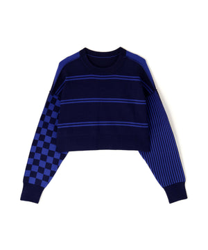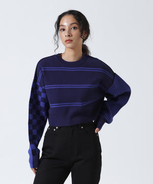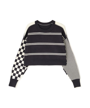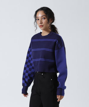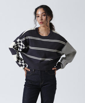 身頃の前後が違う太ボーダーで、袖は右がブロックチェック、左はストライプの4種類の柄をコンビネーションしたマルチボーダーニット。