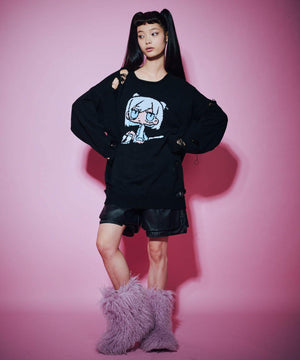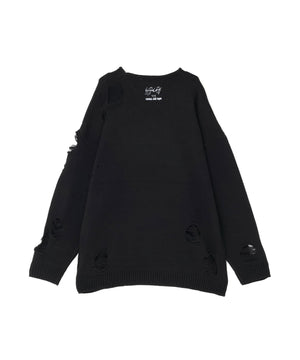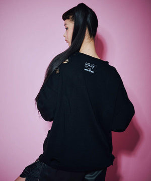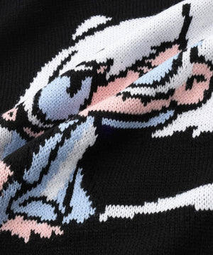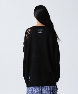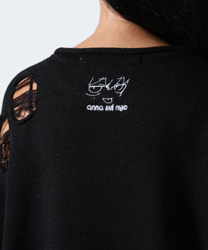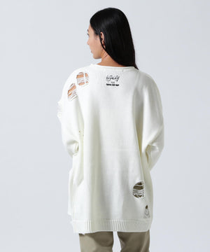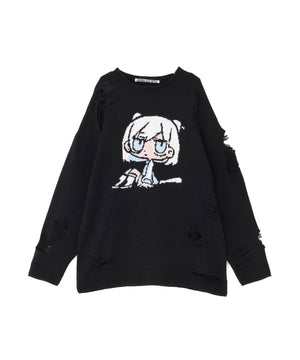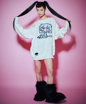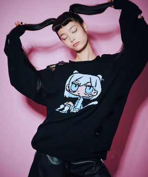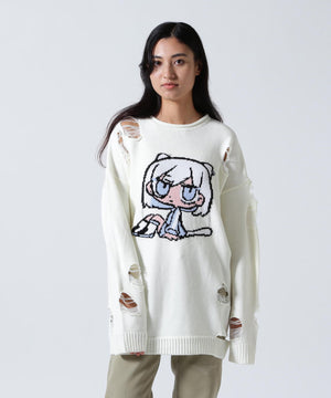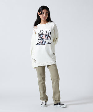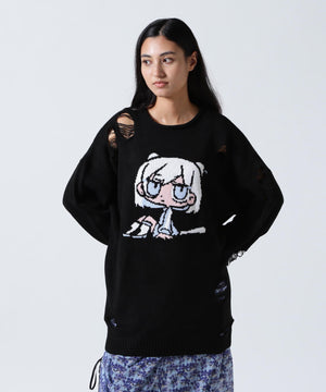 ジャガードで表現したポップなキャラクターモチーフをダメージディテールでガーリー×デカダンスな世界観に表現したオーバーサイズニット。