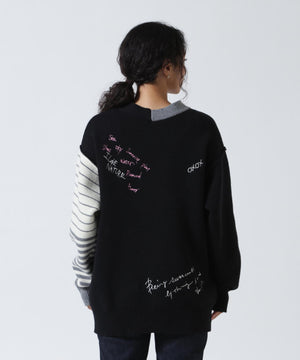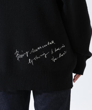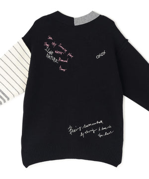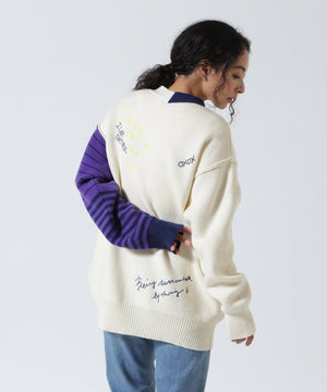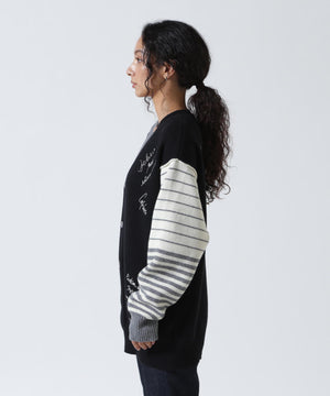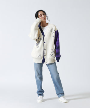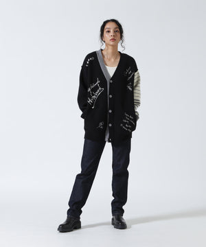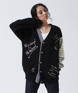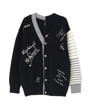色々な手描きのメッセージやロゴが落書きのように書かれた遊び心のあるカーディガンです。