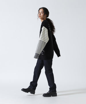 左袖はボーダーのカラーブロック、右前立ても配色で、他にはない目を惹くデザインです。