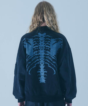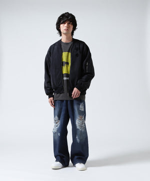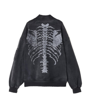 さらにバックスタイルには大胆にスケルトンモチーフのプリントを配置し、圧倒的な存在感のあるボンバージャケット。