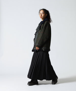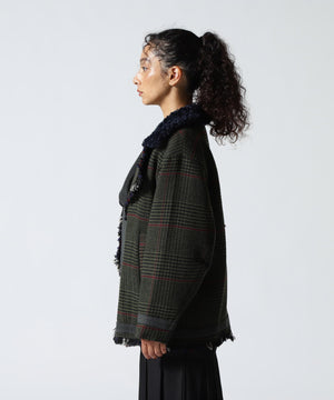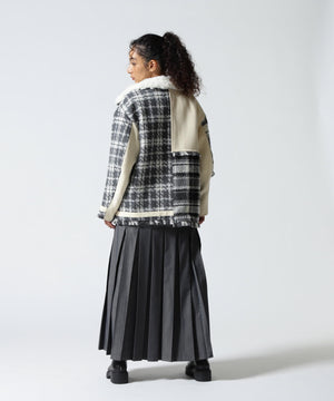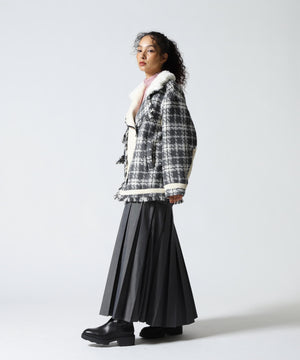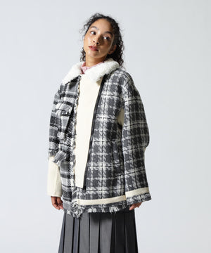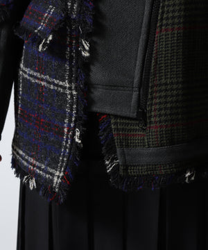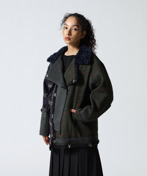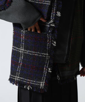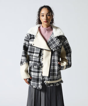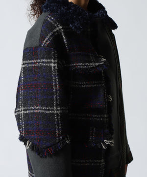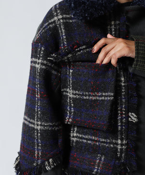 右身頃はツイードチェック生地のフリンジがアクセントになったフラップポケット付きジャケット。