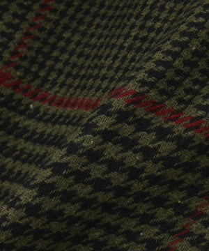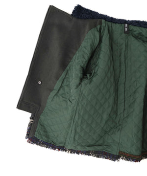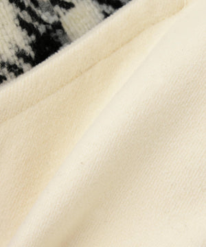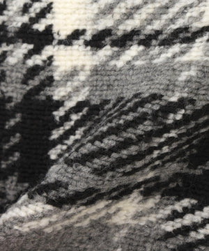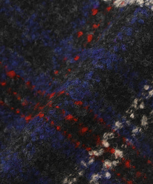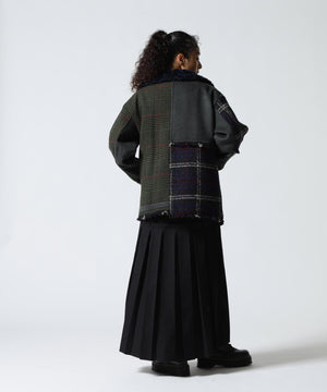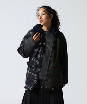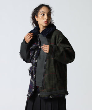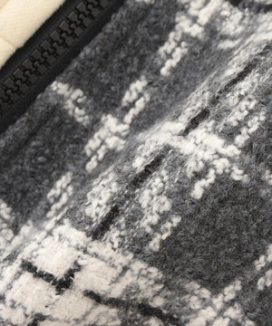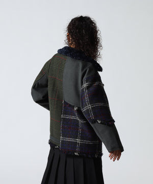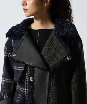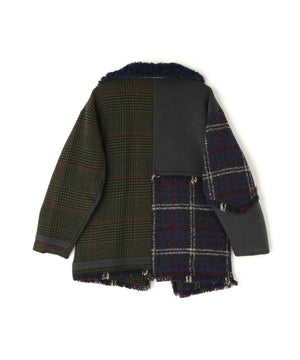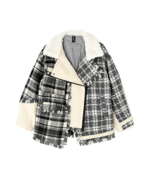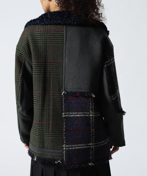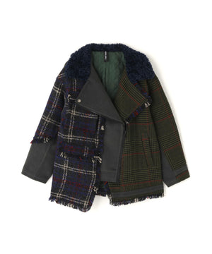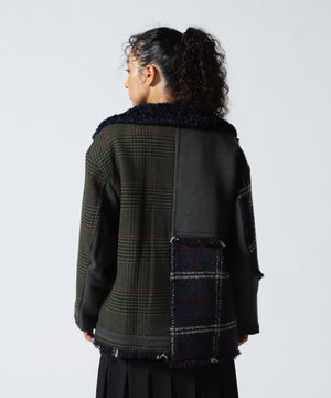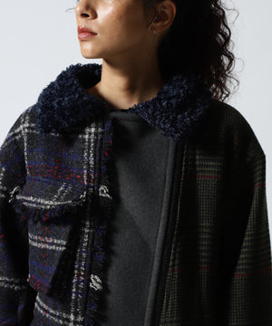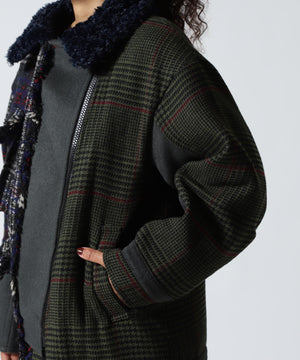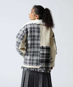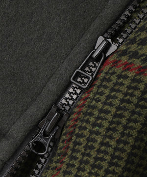 左右で中柄と大柄の2種類の大胆なチェックを使用し、中央には無地モッサを組み合わせたマルチコンビネーションブルゾン。
