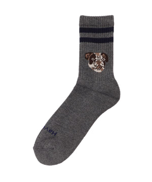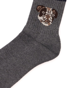サイドにインパクトたっぷりの表情をした犬のデザインをあしらったソックス。