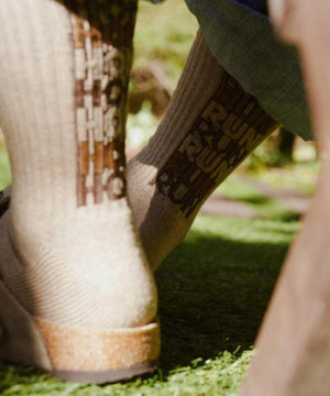 片足には「HOME」、もう片足には「RUN」のデザインが施され、遊び心のあるユニークな仕上がりに。